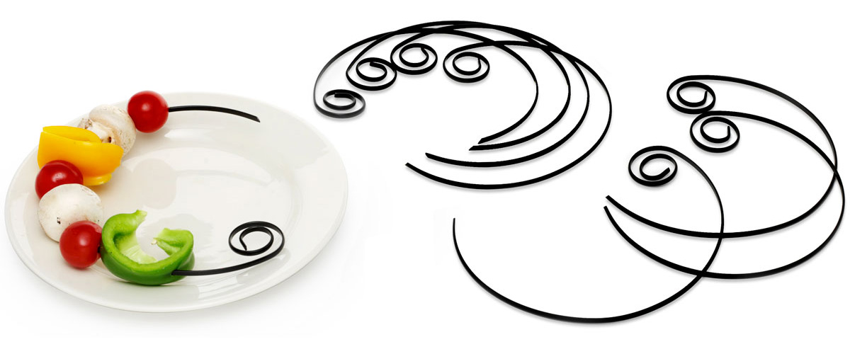 I sure love shish-kabobs, but I'm not certain of the spelling. Are they kebabs, kibobs, maybe a hyphen is needed, er not sure. Anyways, it's a delicious summer food straight from the grill and right on a stick. Besides the spelling problem though, they also don't fit so well on a plate and sometimes just roll right off. No problem, these cool new Curved Shish-Kabob Skewers are the perfect solution. They are 15" long non-stick stainless steel skewers that are curled into a plate-friendly 8" circle. Smart idea, I'm surprised someone didn't think of this before. Comes in a set of 8.