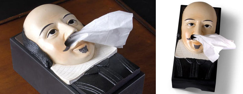 It's time to cover that boring old floral tissue box with something a bit more dramatic, like the Shakespeare Tissue Box Cover. Yes, the legendary Bard has been converted into a cool tissue box cover that allows tissues to dispense from his nose. Great gift for English teachers.