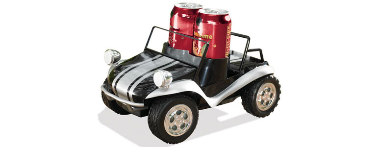 The Remote-Controlled Beverage Buggy is a cool mini r/c dune buggy that you can drive around your home or backyard. Instead of seats it has two cupholders that can deliver ice-cold beers, sodas and more. It's probably a total blast to use it for serving your guests drinks at parties or something, but I doubt the enjoyment lasts for long when you are bumping your wife's ankles trying to get her to reload it with beers from the fridge. Also, it really could use a horn for the full effect.