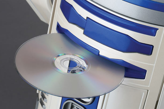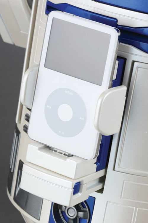 Just like in the first Star Wars movie, this Artoo unit can project a 260 inch, 1024x768 resolution DVD movie or picture (no holograms) onto your wall or ceiling using a 1800 lumen Texas Instruments projector embedded in his dome. In addition to playing back the entire message, R2-D2 also features a complete array of multimedia extras like an iPod/MP3 docking station, CD/DVD player, built-in 20 watt stereo speaker system, memory card reader, USB slots, FM wireless audio out and additional audio/video inputs for connecting video game systems and more. Best of all, he can be maneuvered around the room with the included Millenium Falcon remote control to roll forward, reverse, recline, turn 360 degrees or turn his head.