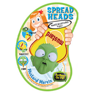 The cool new Spread Heads - Mustard Marvin not only lets your kids play with their food, they get to gross out out the whole dinner table as well! Simply grab a yellow mustard bottle, unscrew the cap, screw on the Mustard Marvin bottle topper head in its place and squeeze away. Poor Marvin then appears to puke up yellow mustard from his mouth all over your hot dog or hamburger. Glorious fun for all!