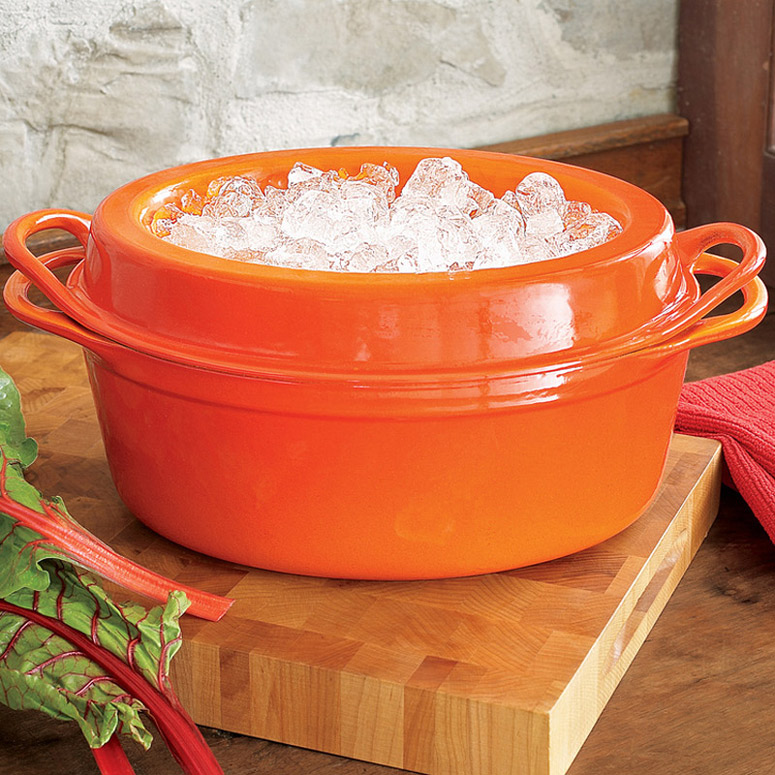 If you like to slow cook roasts, poultry, stews and more, check out this cool new Le Creuset Oval Flame Doufeu. The term doufeu is French for gentle heat and that's what you get with this innovative oval roasting pan. It features a unique concave lid that can be filled with ice to encourage condensation for continuous basting inside. As the food slowly cooks, the ice on top of the lid cools the hot steam inside so that it condenses on the little spikes on the underside of the lid and drips back down to keep the food moist, tender and flavorful. The vessel is constructed of durable cast iron for superior heat conduction and retention and is coated with easy to clean porcelain enamel that is resistant to chips, cracks, stains and odors. This hardcore French cookware is what a crock pot wishes it could be.