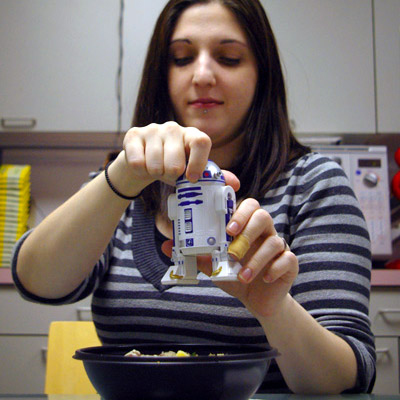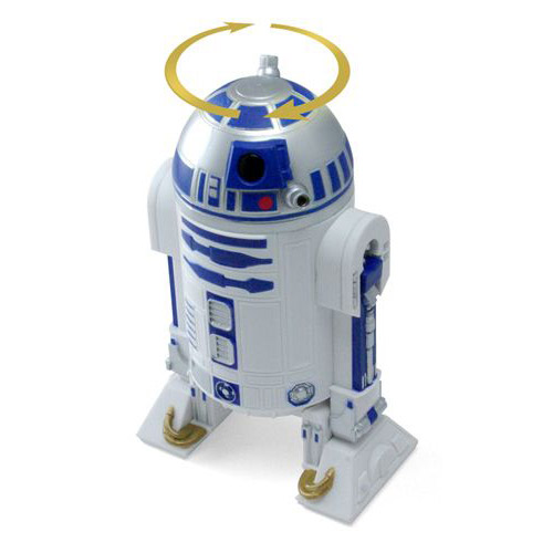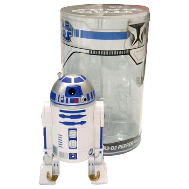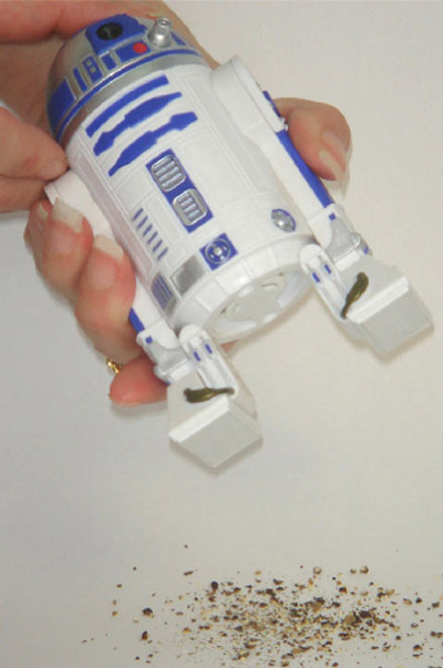 R2-D2's quite a busy droid. When he's not helping to fight off the galactic Empire with Luke Skywalker, serving drinks on Jabbas's Sail Barge or arguing with C-3P0, he can usually be found grinding pepper at seedy space cantinas. Yes, that's right, everyone's favorite Astromech Droid has been shrunk down into the cool new R2-D2 Pepper Mill. Just turn Artoo's domed head and freshly ground pepper comes out his bottom. This secret feature is the main reason the Jawas wanted him in the first place!