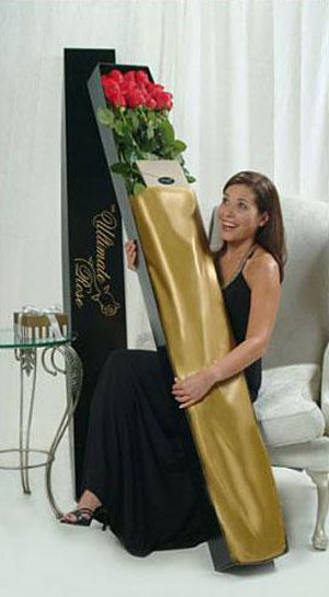 This Valentine's Day, skip the traditional long-stemmed red roses and show the ultimate declaration of love, when you give your sweetheart a dozen of the World's Tallest Red Roses! This stunning bouquet of luxuriously massive roses are grown on an Ecuadorian farm nestled between two volcanoes at more than 9,600 feet, where the native soil, extended sunlight hours and cool night temperatures allow these flowers to achieve heights of 5-6 feet tall and 3-4 inch blooms. A truly unmatched and elegant gift, especially if you have them delivered to her workplace, although it may be hard for her to get back home to thank you. Please, handle with care - these ultimate roses have equally giant thorns!