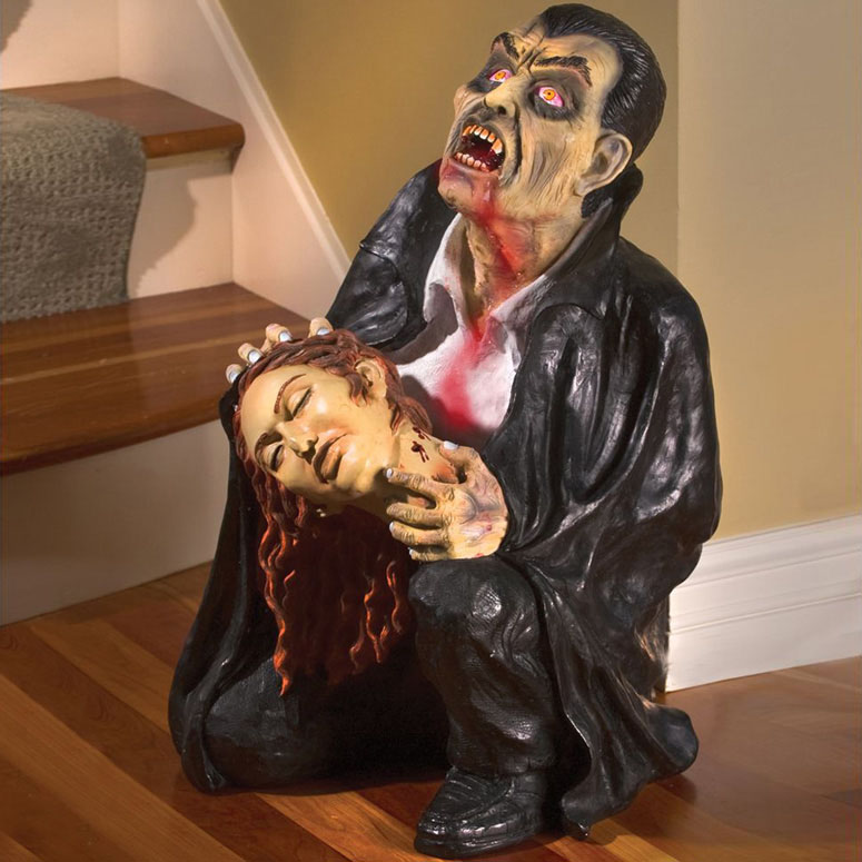 I think it's time vampires were vampires again and that means demonic undead creatures, some very suave, who rise from their coffins at night with an insatiable craving for human blood. Well, that's what you get when you display this cool new and absolutely disturbing Vampire Fountain. This horrific fountain depicts a bloodsucking vampire holding the decapitated head of his victim with blood gushing out of his fanged mouth, down his shirt and into a recirculating basin hidden in his lap. Don't worry about putting a stake through his heart, it's only water enhanced with a little optional food-coloring. It's the perfect decorative touch around Halloween, but since there seems to be no end to vampire love anytime soon, it's fitting year round.
