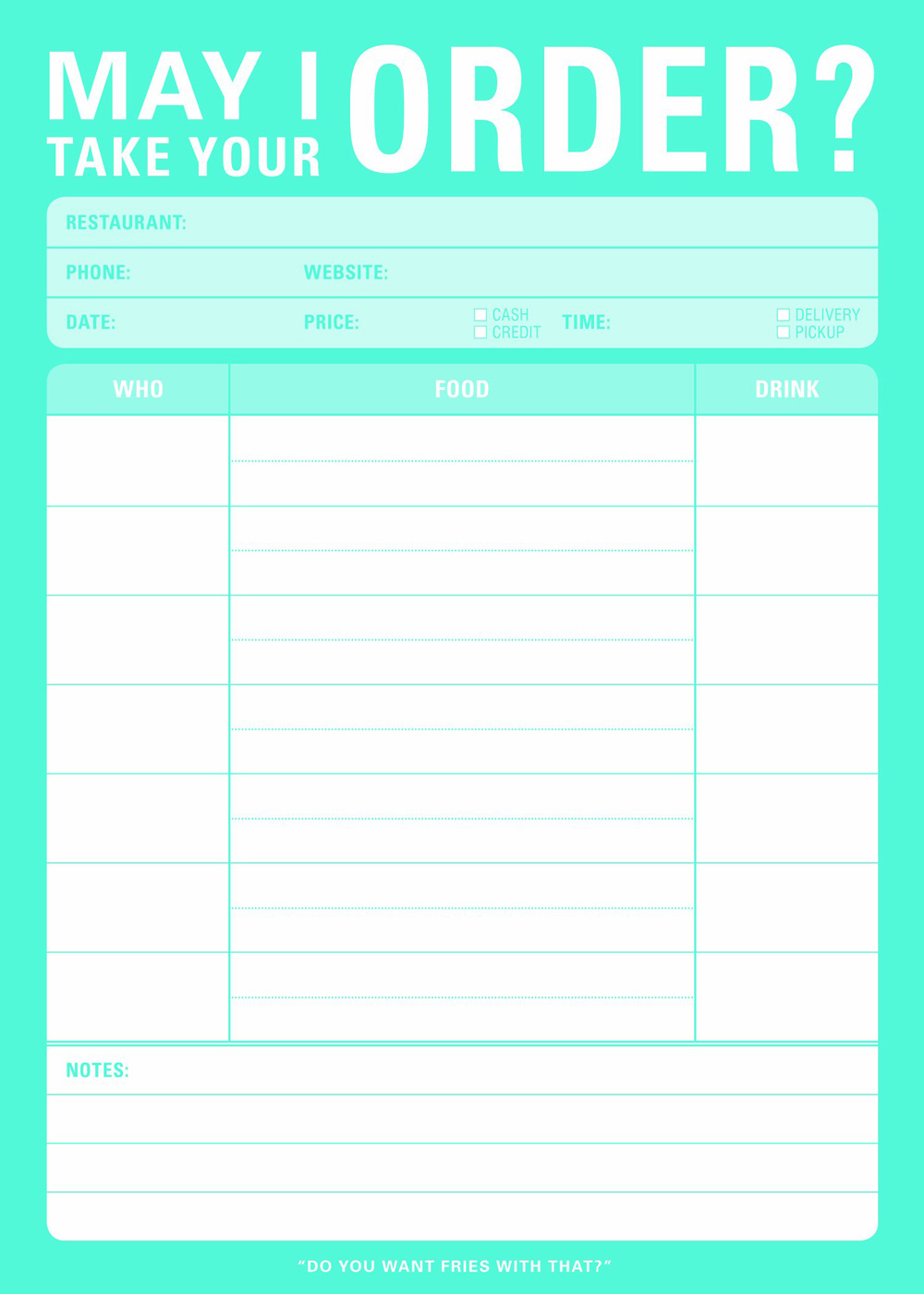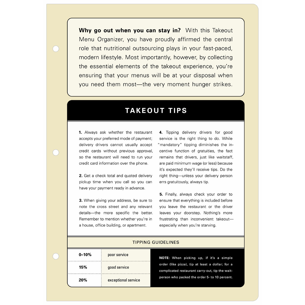 If you've got a mess of takeout and delivery menus and restaurant phone numbers, keep them all neatly organized and in one place inside this cool new Zippered Take Out Menu Organizer. This sturdy, zippered three-ring binder features 5 tabbed folders that can be labeled by restaurant type, location, and more, a 40 sheet notepad for writing down orders before you call them in, a frequently called numbers list and a handy tipping guide and chart. Great solution.