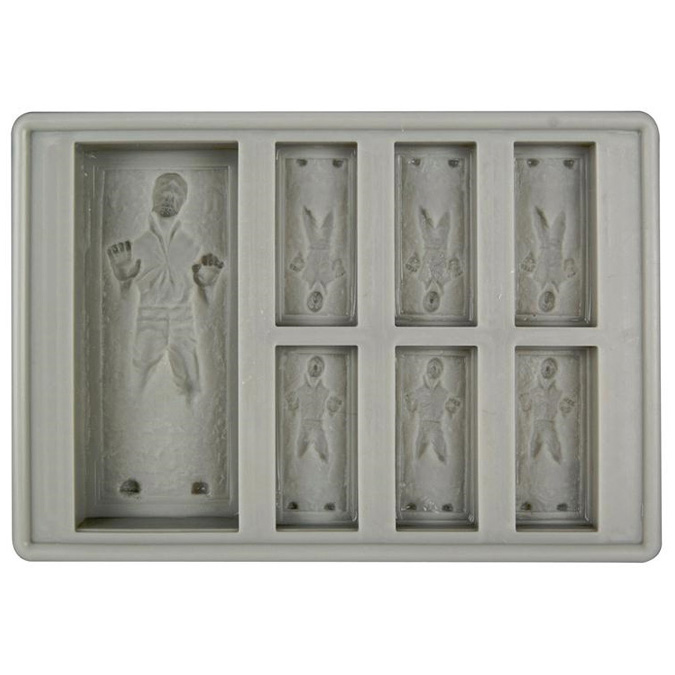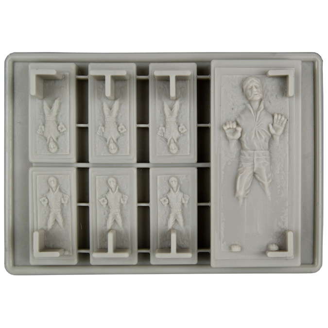 After all these years, the most obvious and most wanted ice cube tray in the galaxy has finally been unleashed - the cool new Han Solo Frozen In Carbonite Ice Tray. This ingenious silicone ice cube tray creates one large Han Solo frozen in Carbonite and six smaller ones. No Cloud City Ugnaught assistance is required to create your own frozen smugglers, just fill up the mold with water and freeze. A prized possession for any proper home cantina or alien gangster's palace!