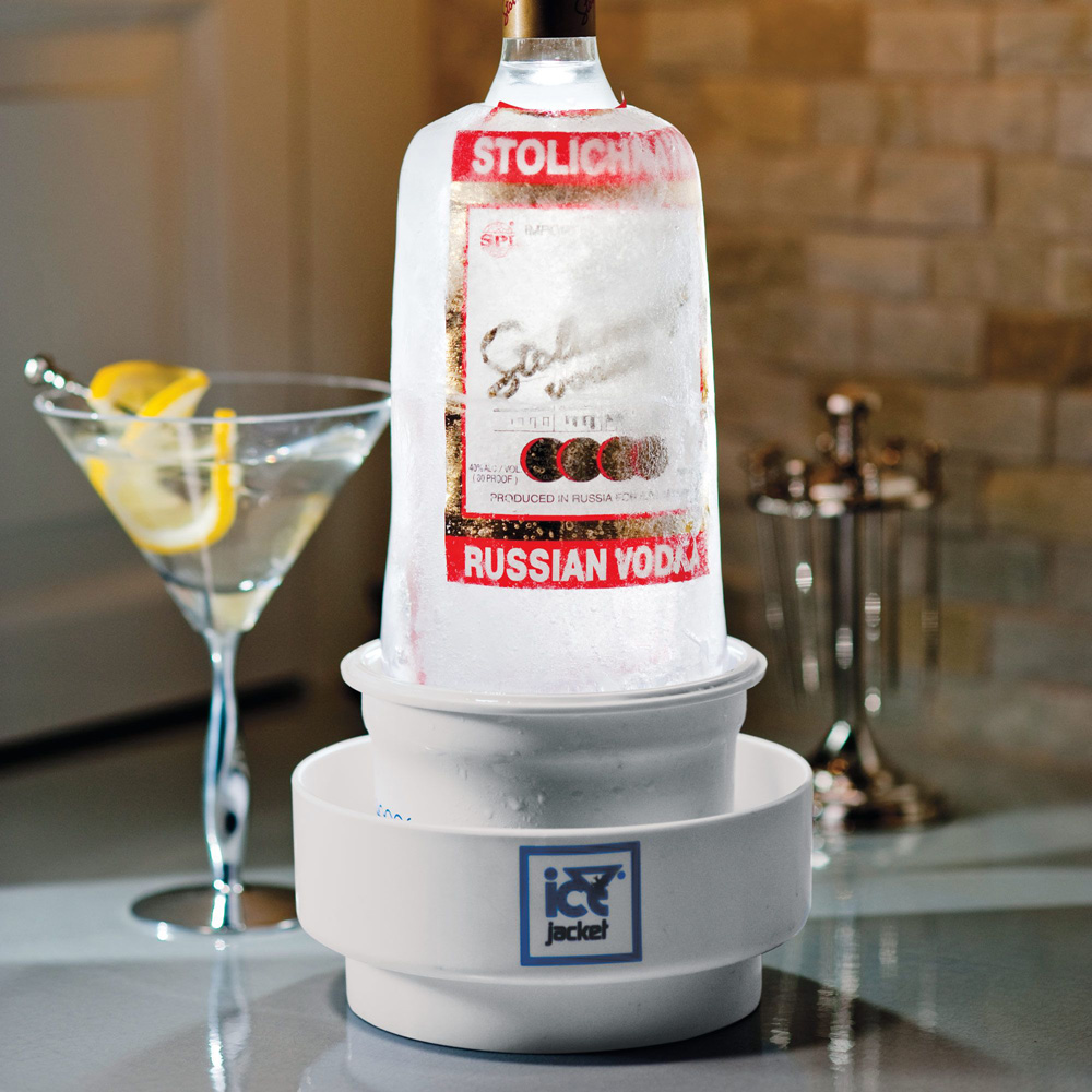 The literally cool new Ice Jacket encases a bottle of your favorite booze in a thick layer of ice that chills it down to an ice cold 20 degrees F. Just insert a bottle of vodka or other favorite libation onto the base grip, slip on the water-tight sleeve, close the clips, fill with warm water, plug and freeze for 7-8 hours. Now just remove the sleeve and the base remains attached for comfortable pouring. The chilled liquor acts as insulation to keep the ice from melting too quickly and will last for a few hours with all drips safely contained in the drip tray. So don't just chill your vodka in the freezer, entomb it in a cool layer of ice as well!