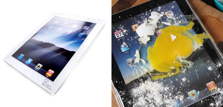 Paper cookbooks are collecting dust in the 21st century as more and more of us are turning to tablets like the iPad in the kitchen. Nearly unlimited recipes, demos, and tips can be easily accessed through them, but unlike a cheap, replaceable book, this modern technology is sensitive, expensive and not all that compatible with the splatters, spills, and messy hands expected in a kitchen setting. The solution is simply to slip your tablet into one of these cool new iPad Chef Sleeves.