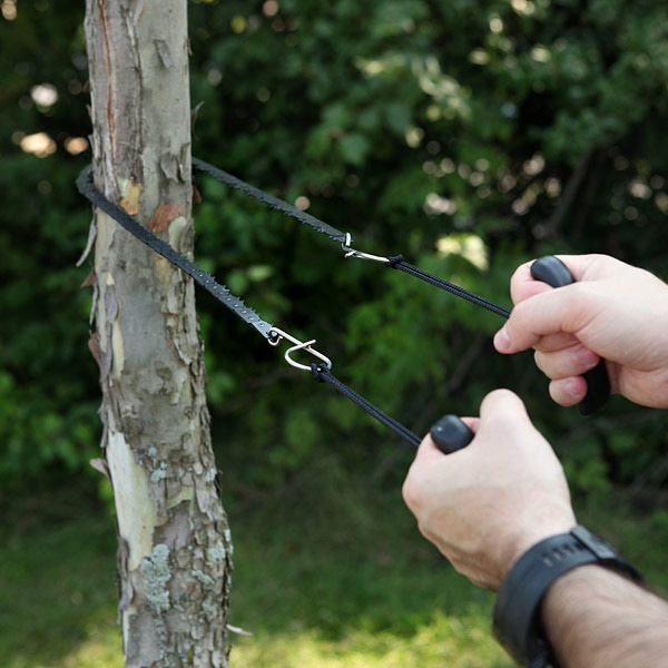 When you're out camping, hiking, biking, hunting or just have something against trees, be forever prepared to saw any wood in your way when you carry this cool new Pocket Chainsaw. Just unroll this lightweight, yet heavy-duty chain of saw blades from the carrying can, loop the handles on, wrap it around a limb and pull back and forth. It's constructed from high strength, heat-treated steel with 124 bi-directional teeth that quickly saw through 3" diameter limbs in only 10 seconds or less. A great portable sawing solution when a gas-powered chainsaw isn't an option.