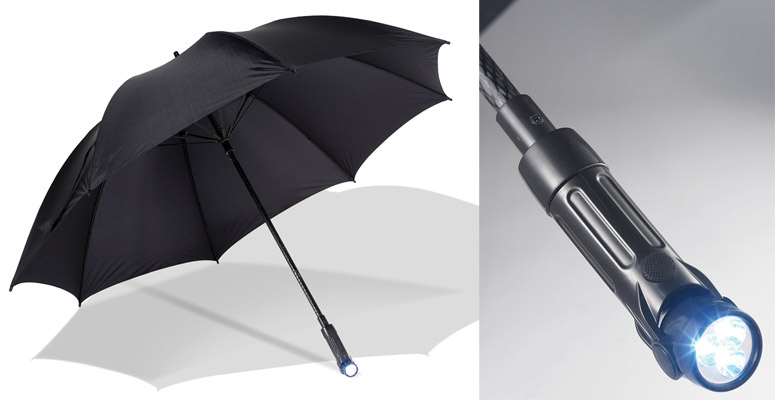 If you'll be taking any strolls down dark and stormy paths, be sure to bring this cool new Path Illuminating Umbrella. This innovative umbrella has a handy flashlight built right into the handle to illuminate the walkway ahead of you up to 30'. It features three bright white LEDs that provide 100 lumens of light, a flashlight that articulates up to 180° and corrosion-resistant fiberglass ribs and spreaders support its 60" nylon gust-resistant canopy. Great solution for dog walkers.