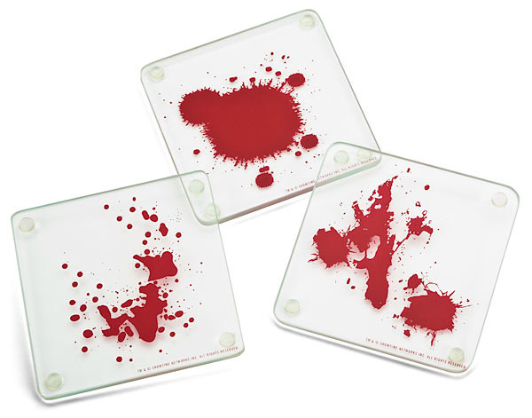 If you watch the Showtime TV show Dexter, then you know how this lovable serial killer likes to keep a drop of each victim's blood on a glass slide as a trophy, all stored neatly inside a wooden box hidden inside his air conditioner. Well, now you can be a copycat serial neat freak with these cool new Dexter Blood Spattered Coasters. This set of six clear, acrylic coasters look like microscope slides with each one imprinted with a hopefully replicated blood splatter of one of his kills, all stored inside a slotted wooden case that you can also keep hidden inside your air conditioner. It's definitely much easier to protect your table from condensation rings and spills with these than having to hang up sheets of plastic everywhere!