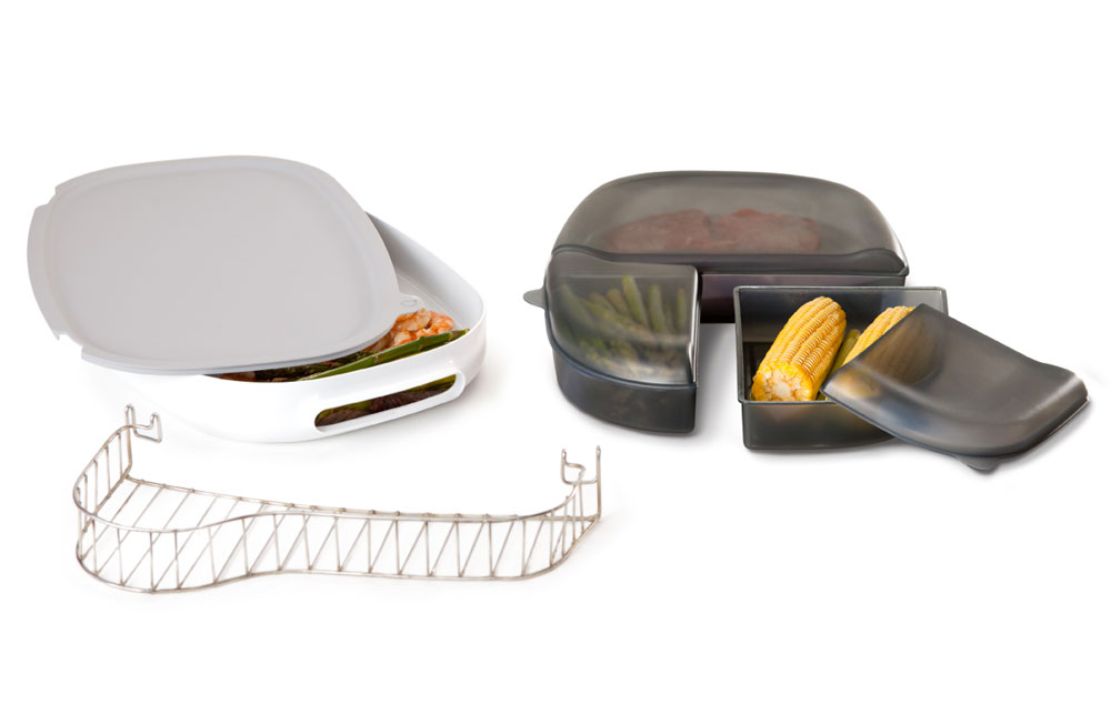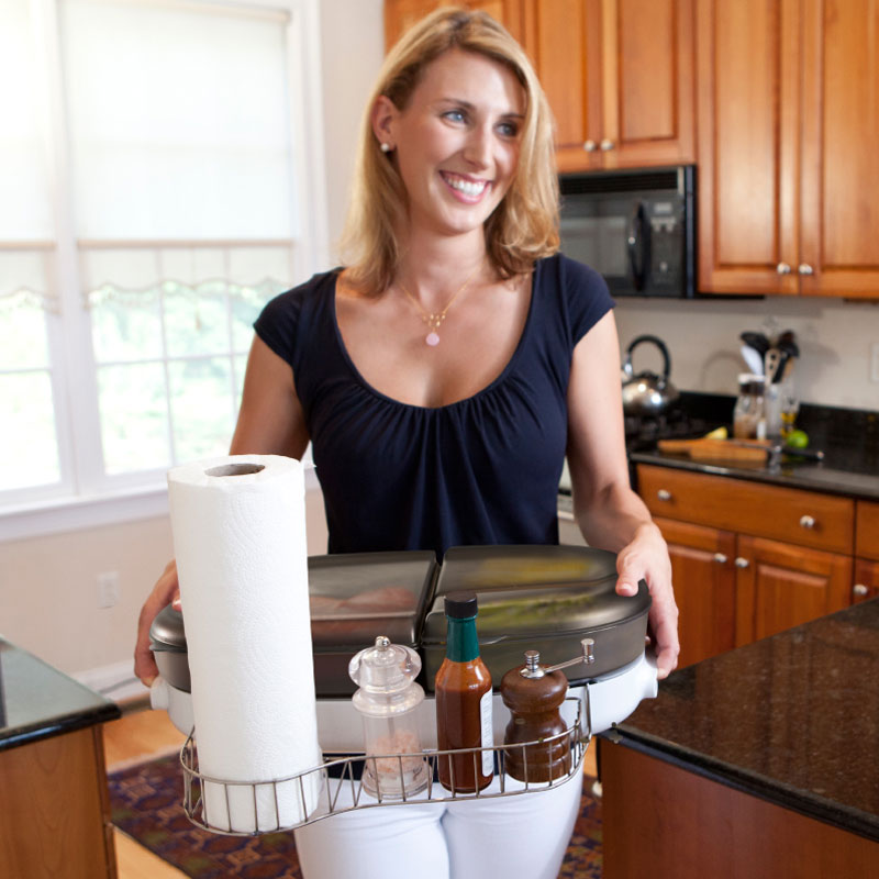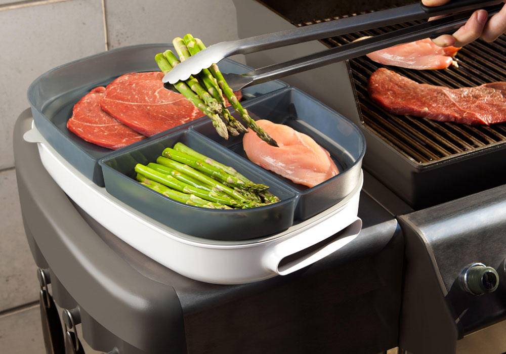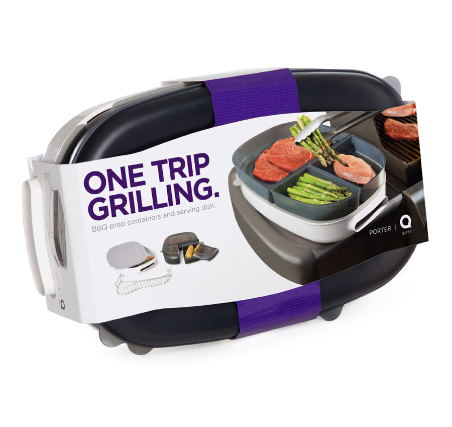 Summer is upon us once again and that not only means plenty of cookouts, but endless trips back and forth from the kitchen to the grill. The solution is to use the cool new Quirky Porter - BBQ Prep and Serve Tray. This innovative multi-purpose two-tiered BBQ tray lets you carry out and keep separated all the food you plan to grill in one easy trip. It features three generous containers with lids, a handy condiment caddy that holds a paper towel roll and seasonings, and a serving tray that all connect for convenient transport. Great idea.