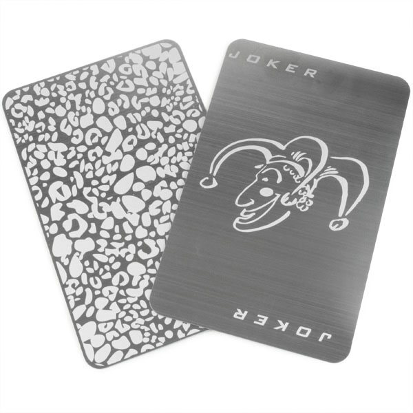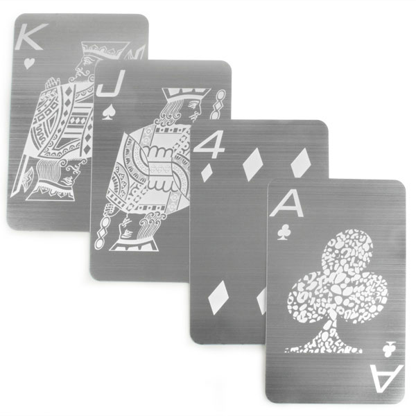 It's time to recycle those boring old paper playing cards and upgrade to something way more durable and stylish like these cool new Stainless Steel Playing Cards. Each playing card in this full deck is crafted from brush satin finished high grade stainless steel, etched with a modern slanted design in classic English style and presented in a foam lined black needle cord box. They not only add a luxurious touch to any poker game, they may or may not deflect a bullet when you get caught cheating with an ace up your sleeve. For safety's sake, please avoid throwing these metallic cards or playing 52 Pick Up.