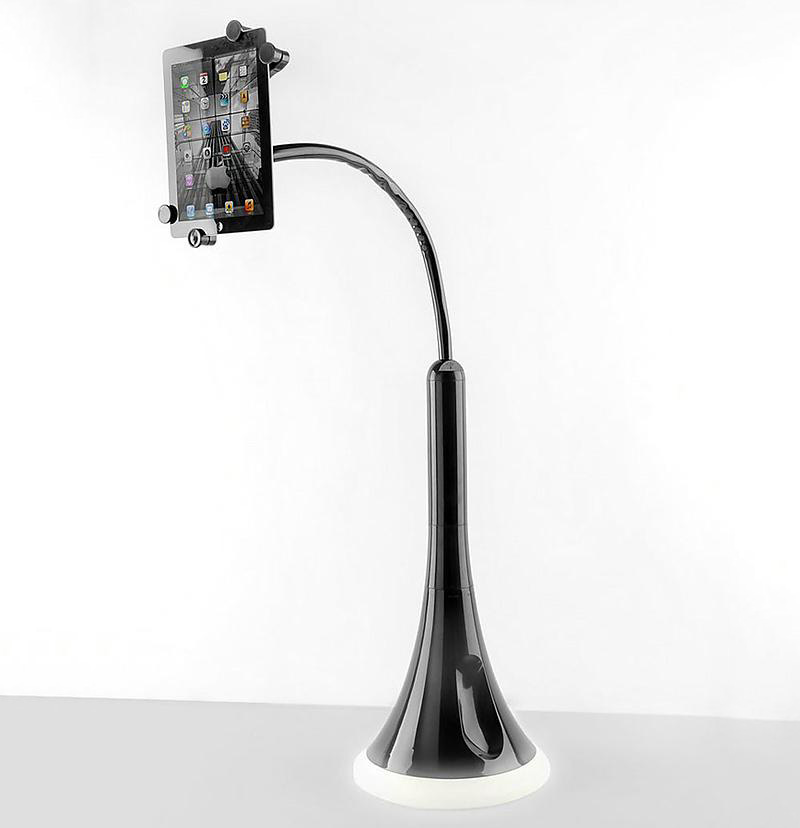 The cool new iPad Charging Floor Stand holds your iPad up so you don't have to, plus it keeps it charged as well. Just slip your tablet into the tension bracket holder, bend the mounting arm to a comfortable position, and go hands free. It features a conical base that is illuminated by a ring of 8 LEDs that act as a nightlight or accent light, a USB port at the top that connects to the power cable for charging, and can be set to portrait or landscape orientation. It's perfect for surfing the web or reading a ebook on the couch or in bed, watching movies while exercising, following recipes in the kitchen, displaying your digital sheet music while practicing a musical instrument, or any other reason you can think up.