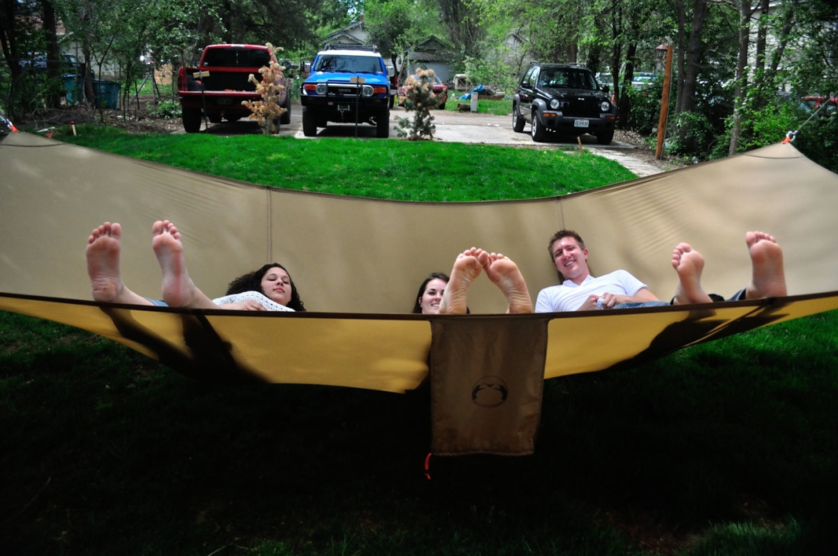 Why would anyone ever want to lazily hang around their backyard all day snoozing in a tiny cramped regular hammock when they could be lounging in ultimate comfort from this cool new Mega Hammock? This massive hammock is big enough for up to three people or perfect for one person to truly stretch out and relax on. It's handmade in Monument, Colorado from coated ripstop nylon in four different colors (custom sizes available too) and securely hangs from all four corners, so way easier to get on without spinning out of it. I'm getting all sleepy just looking at it.