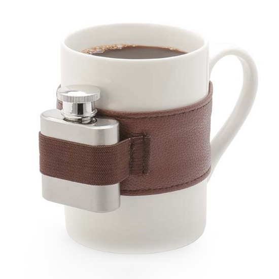 The cool new Extra Shot Coffee Mug has a miniature stainless steel shot flask strapped to its side via a stylish leather belt. Now, do you fill this mini flask with a shot of espresso, a shot of creamer, a shot of flavor, or best of all, a shot of Irish Whiskey?