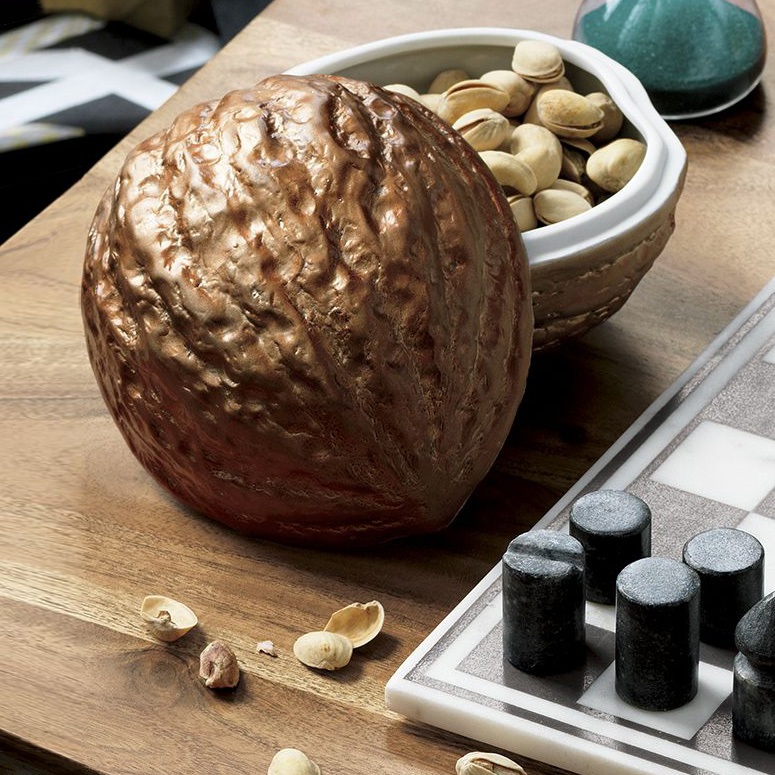 The cool new Walnut Nut Bowl is, yep, a bowl for serving nuts that looks like a giant walnut. This handmade porcelain walnut opens easily (no nutcracker required) to reveal two bowls that can be used to hold nuts and discarded shells, candy and wrappers, or whatever you think presents nicely in a big walnut. It features a hand-painted copper exterior, a glazed white interior, and may or may not attract giant squirrels.