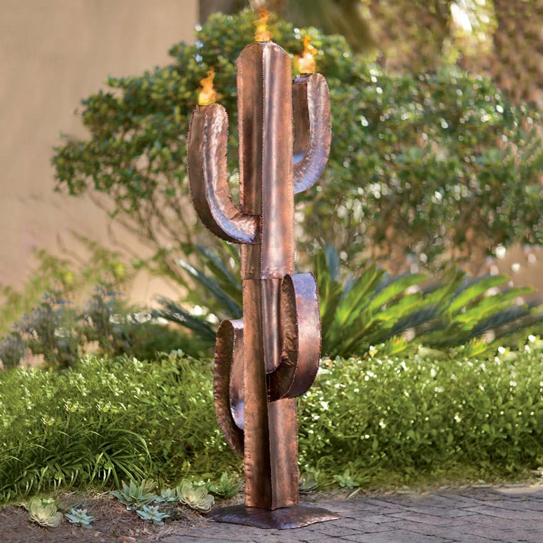 If your sick and tired of the same old boring island party theme and tiki torches littering your backyard, then take your next soiree to the Southwest when you light up these cool new Large Recycled Metal Saguaro Cactus Torch. At first glance it may seem like you have a massive six foot tall Saguaro cactus with flames bursting up from its curved limbs, but it's actually a faux cacti torch handcrafted by Bali artisans from reclaimed sheet metal with a weather-resistant antique copper finish. Just fill the three included fire pots with torch fuel, light, and enjoy a relaxing evening outdoors with some unique flickering Southwestern ambiance.