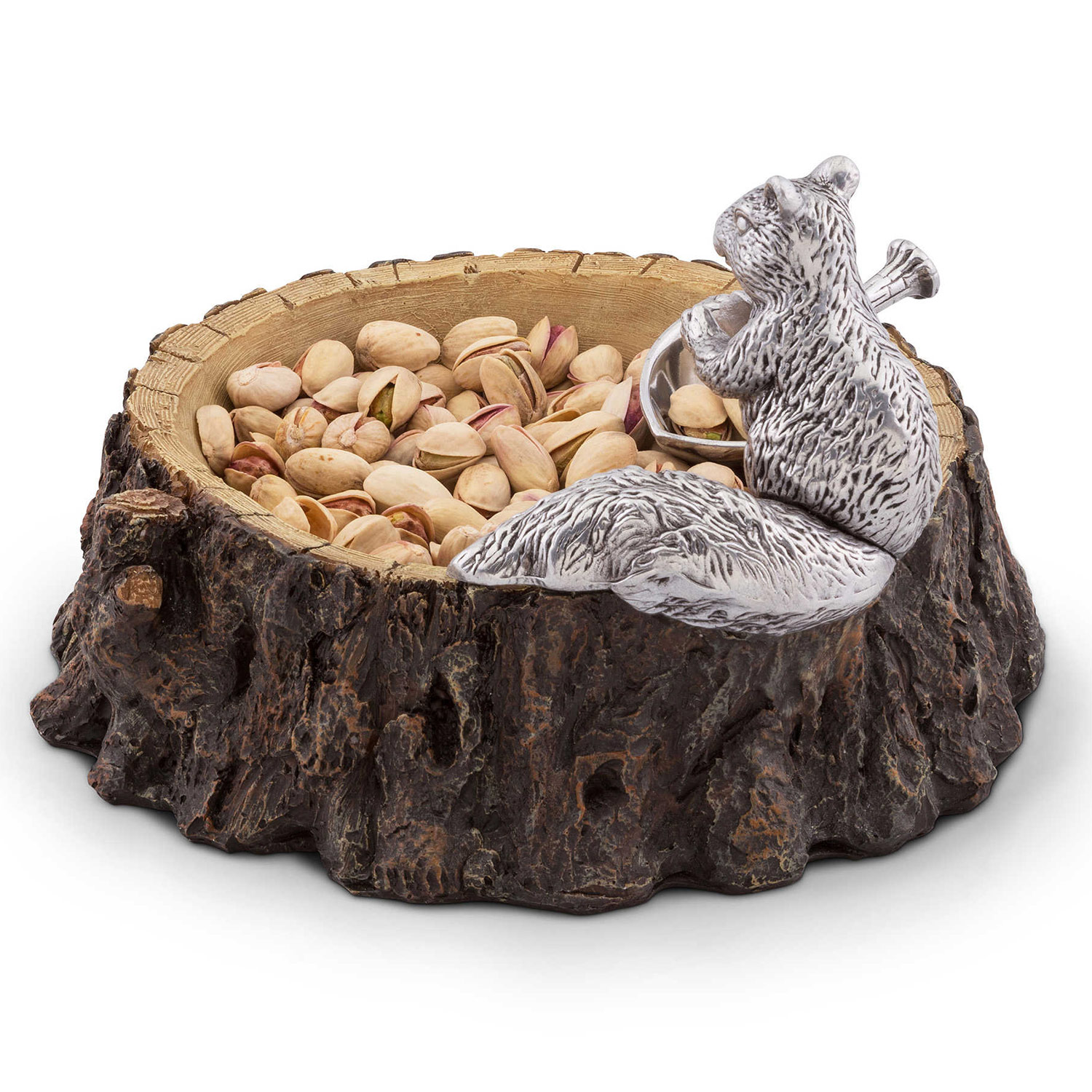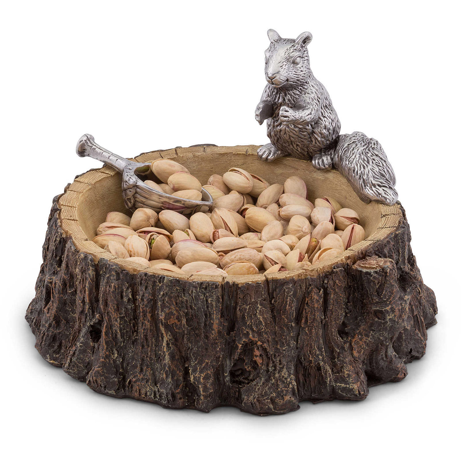 This cool new Standing Squirrel Nut Bowl from Arthur Court Designs is a whimsical little nut bowl that looks like a hollowed out tree stump with an aluminum squirrel standing on the edge ready to dive in to the nuts. Each bowl is created entirely by hand from high quality resin with a sand-cast aluminum squirrel figure and matching acorn-shaped scoop that can be held in the squirrel's paws. Pairs nicely with the Squirrel Nutcracker.