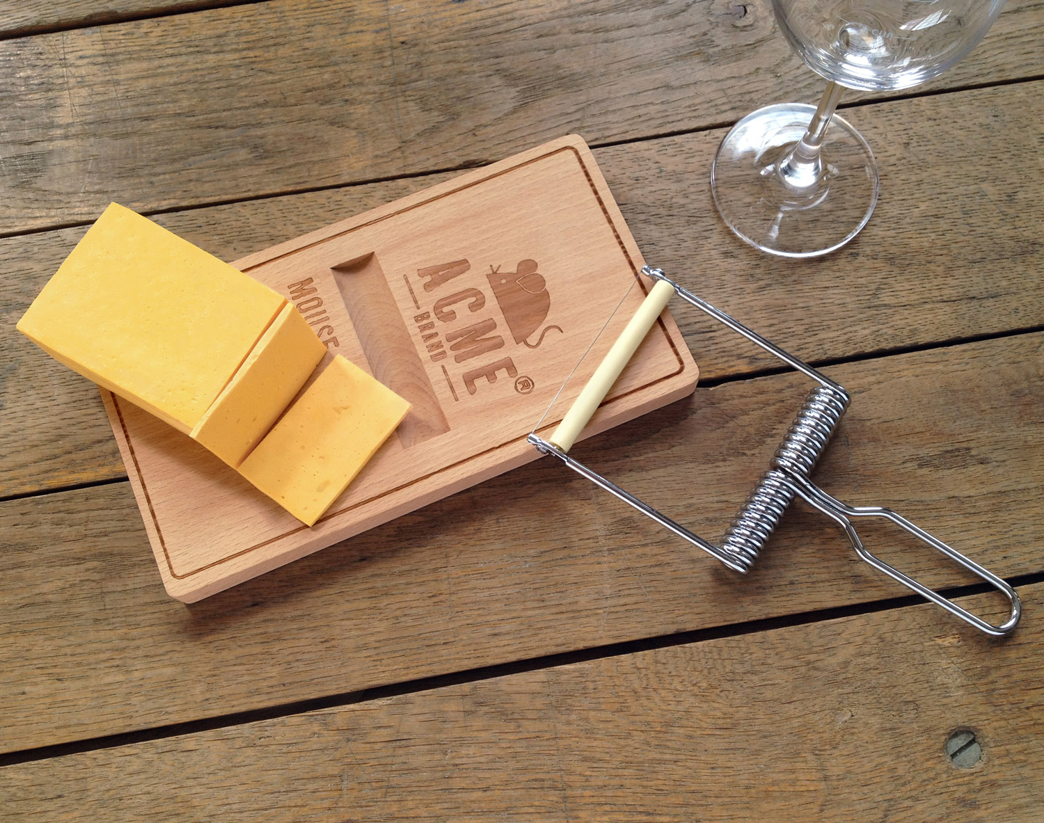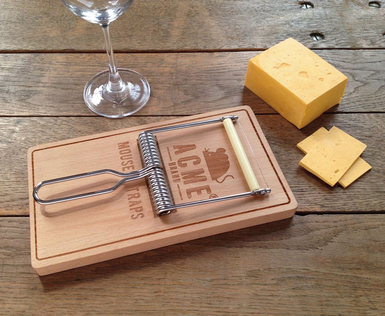 There's only one word that perfectly sums up this cool new MouseTrap Cheese Cutting Board. Clever. This fun cheese cutting board looks like a giant mousetrap with a beech wood base and a stainless steel spring trap cheese cutter. The only downside is when your guests are just a bit afraid that it will snap their hand right off when they reach for a hunk of cheese. Hmm, it might also attract gigantic cheese-loving mice!
