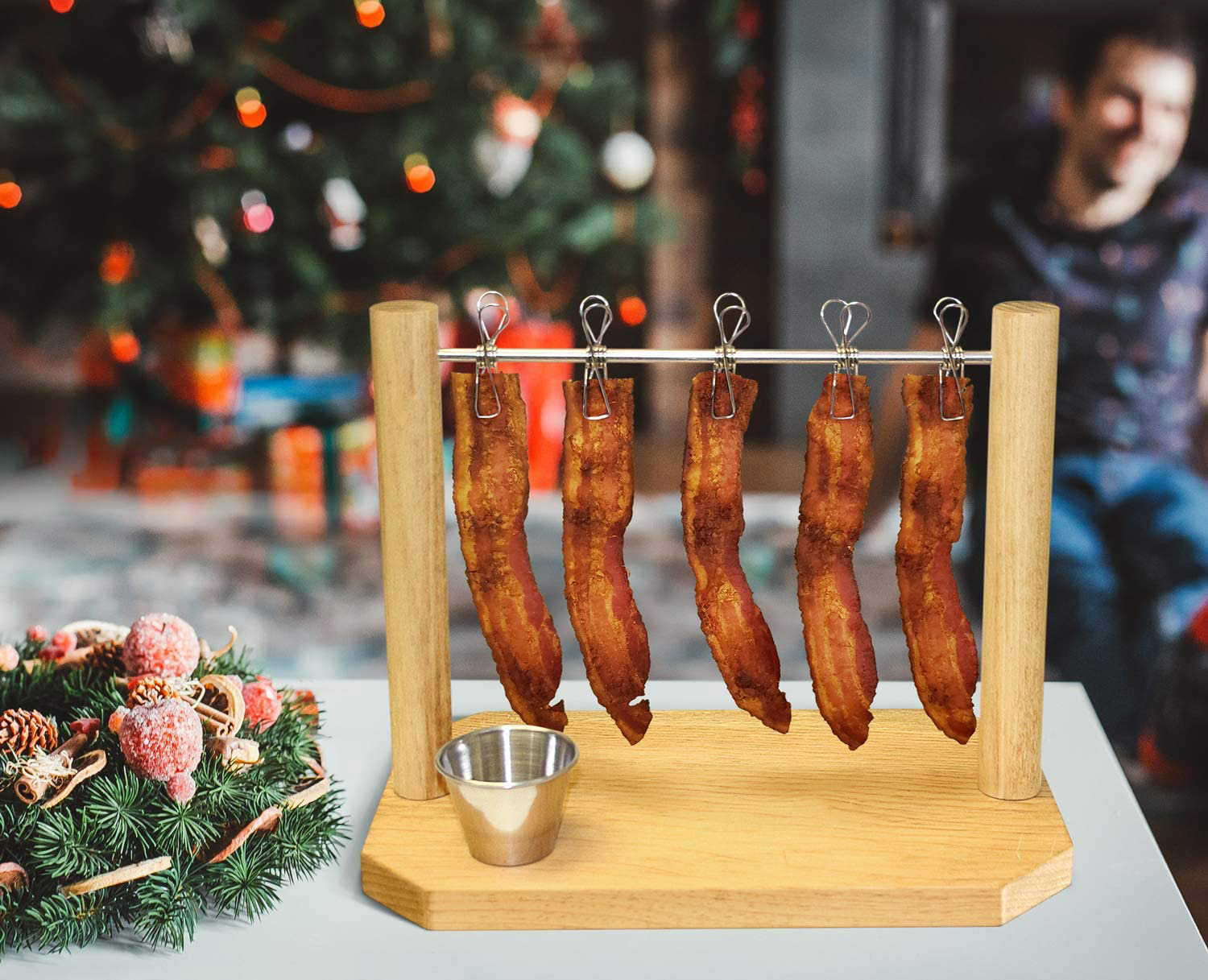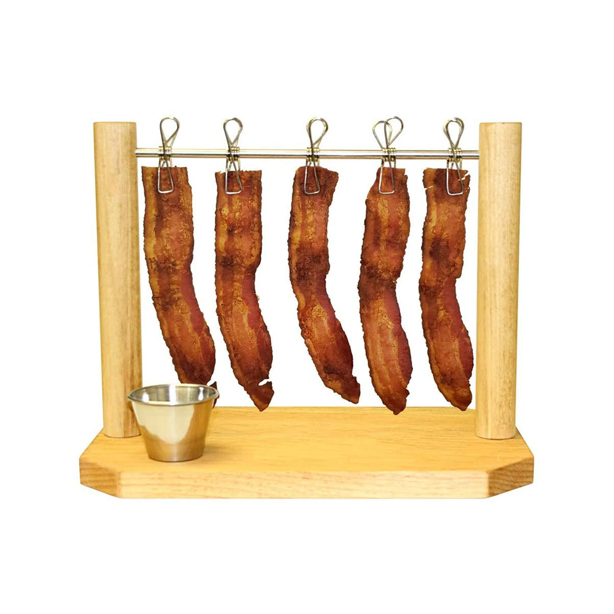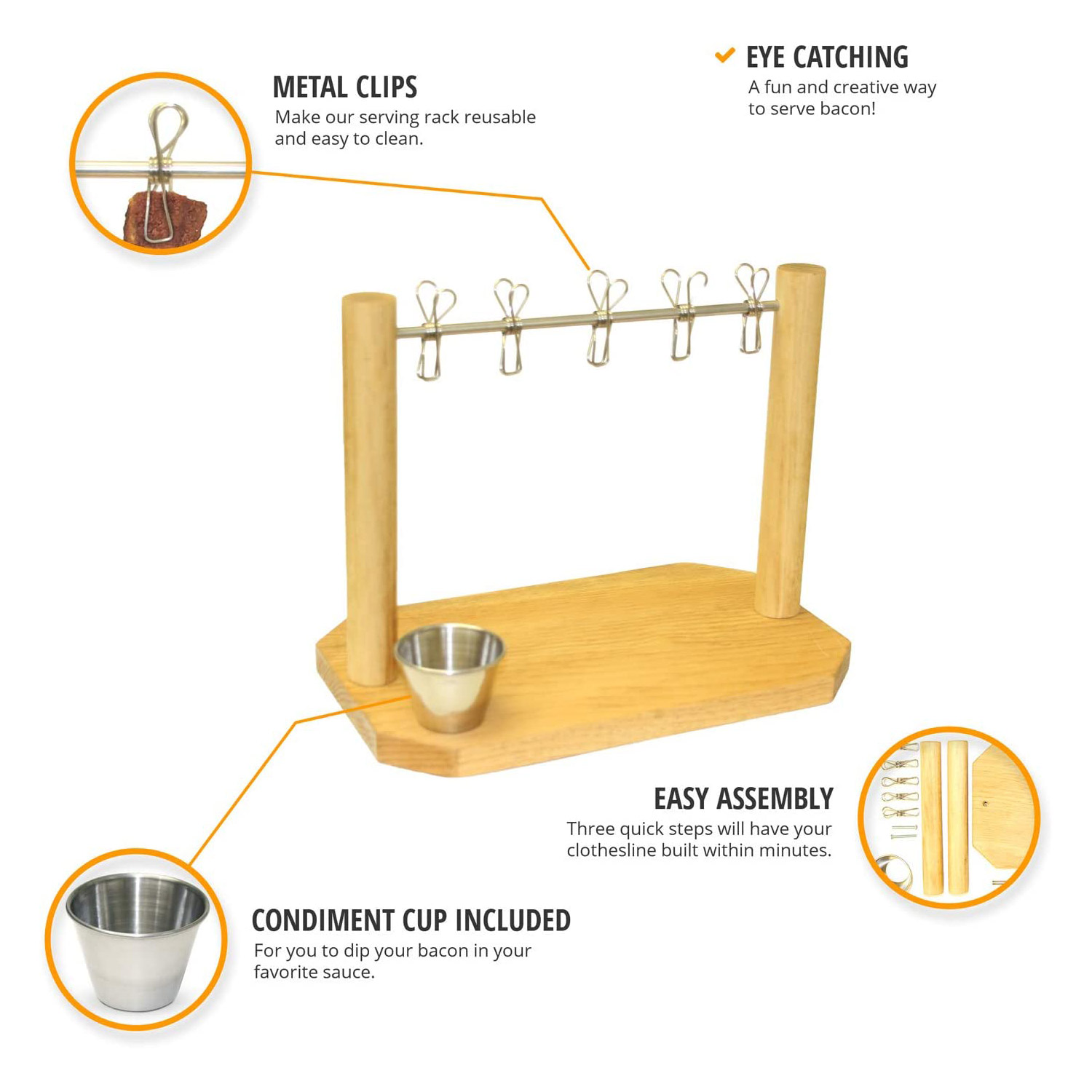 When an opportunity arises to present your finest gourmet bacon to hungry family, friends, and guests at breakfast or as an appetizer during the big game, then hang up and put those perfect, crispy slices on full display with this cool new Back Bay Dining Bacon Clothesline. Yep, a clothesline to hang up slices of bacon now exists and it's the more fun and creative way to display regular bacon, smoked bacon, candied maple bacon, pork belly, Canadian bacon, or any other kind of bacon you can make work. It features a wooden base and frame, metal clothesline, 5 metal clothespin clips, and a metal serving cup for dipping the bacon slices into your favorite condiments and sauces. Since it's reusable, it would also be a unique way to serve up bacon at restaurants as well.