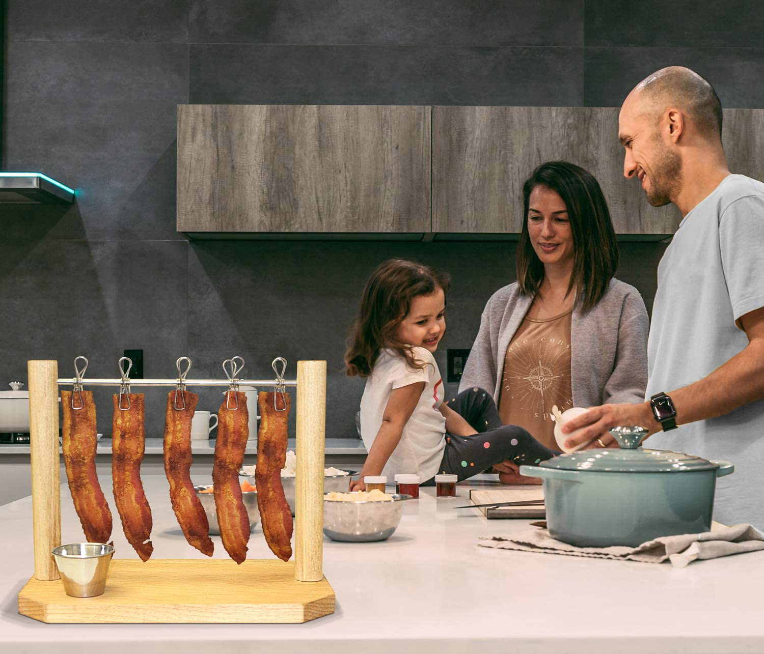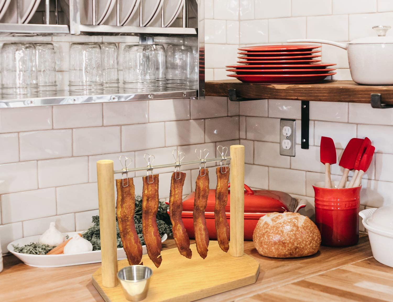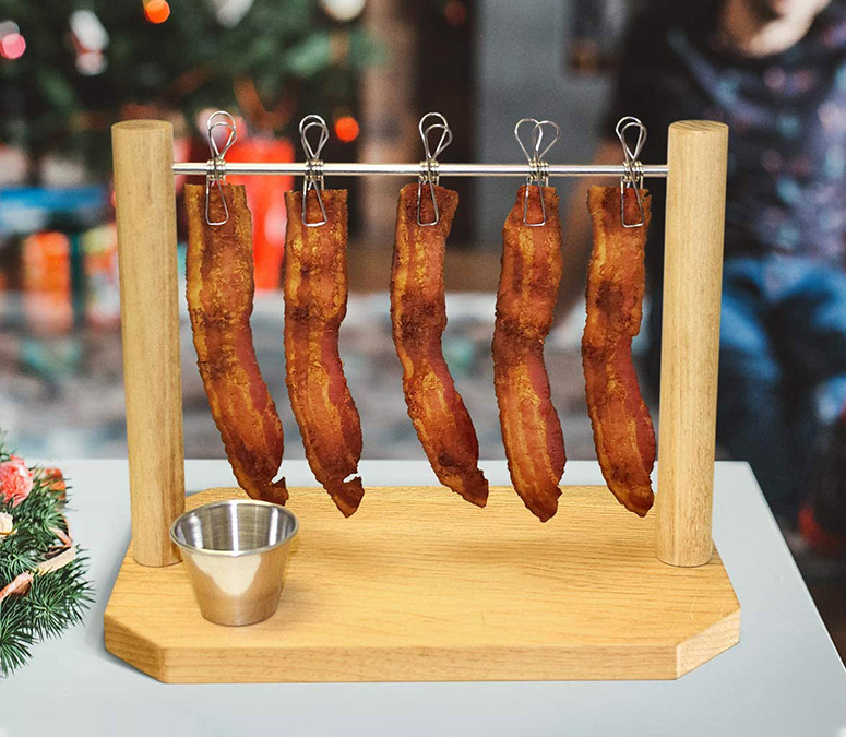 When an opportunity arises to present your finest gourmet bacon to hungry family, friends, and guests at breakfast or as an appetizer during the big game, then hang up and put those perfect, crispy slices on full display with this cool new Back Bay Dining Bacon Clothesline. Yep, a clothesline to hang up slices of bacon now exists and it's the more fun and creative way to display regular bacon, smoked bacon, candied maple bacon, pork belly, Canadian bacon, or any other kind of bacon you can make work. It features a wooden base and frame, metal clothesline, 5 metal clothespin clips, and a metal serving cup for dipping the bacon slices into your favorite condiments and sauces. Since it's reusable, it would also be a unique way to serve up bacon at restaurants as well.