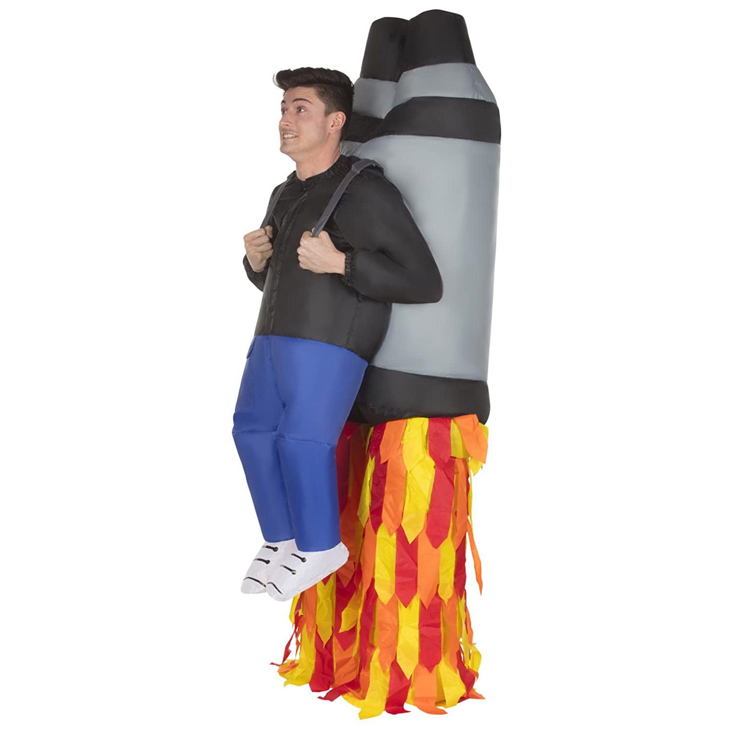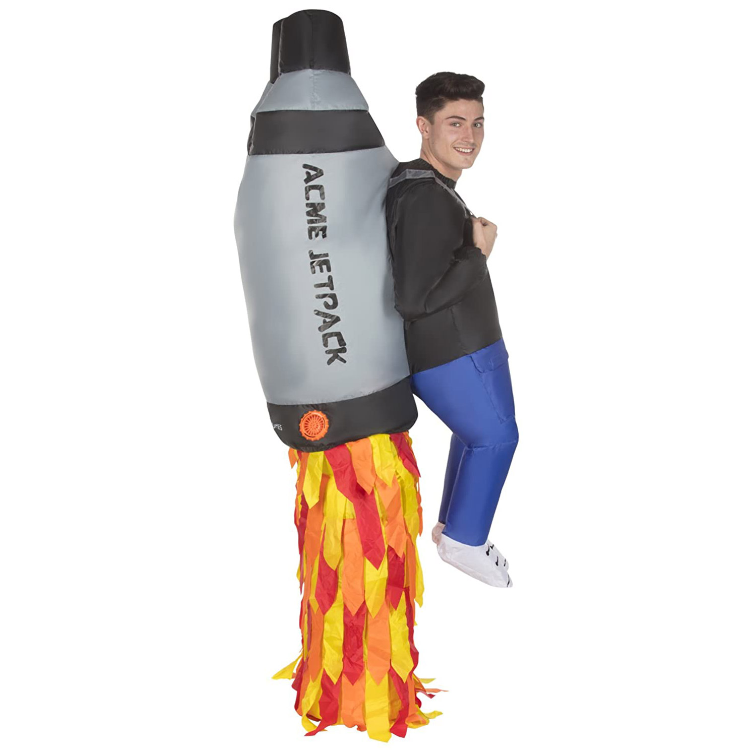 Rise up above the Halloween party or just stand out at a jetpack enthusiast convention with this cool new Jetpack Pick Me Up Inflatable Costume from Morph Costumes. This double-take-inducing inflatable costume creates the illusion that you're hovering above the ground with a jetpack strapped on your back. While the top half of your body fills out the shirt of the jetpack wearer, your legs are hidden away in the fiery exhaust coming off the engines in the back. Faux inflated legs then dangle on the front. Just step into the costume, zip it all up, and turn on the built-in fan to inflate the whole thing in seconds. Unfortunately, the fan isn't strong enough to generate actual liftoff.