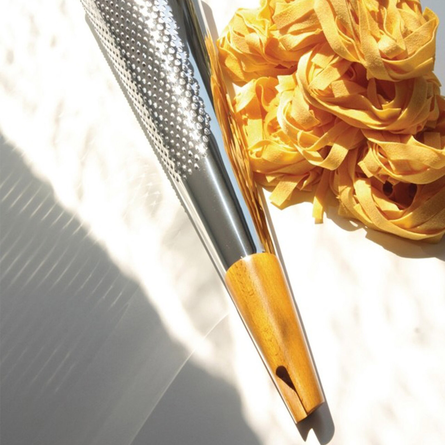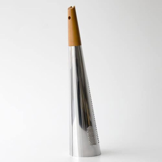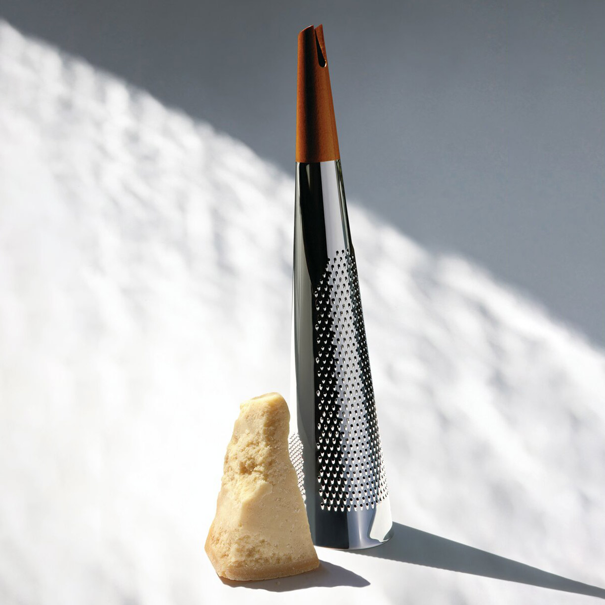 Who would have thought that a simple cheese grater could ever be functional object of desire for all to admire when in use or just placed proudly on display? Behold! This cool new Alessi Todo from designer Richard Sapper is the ultimate kitchen tool for grating the finest hard cheeses like Parmigiano-Reggiano over pasta and doing it in style. This giant cheese and nutmeg grater is crafted from stainless steel with a beautiful wooden handle and has a long cone shaft with a grater on one side that can grate enough cheese in one stroke for one portion. The cheese is then directed down the inside of the smooth steel funnel for precision dispensing over foods. When finished wowing your dinner guests at the table, simply hand wash and leave out for all to enjoy its cheese grater magnificence.