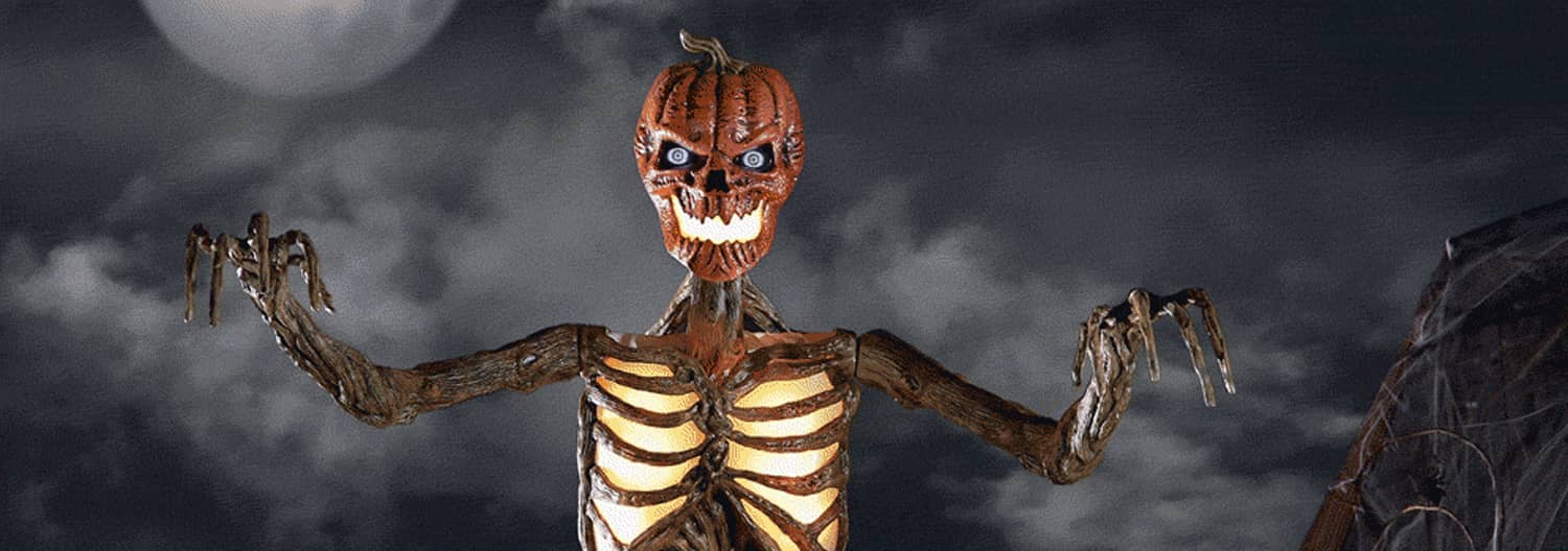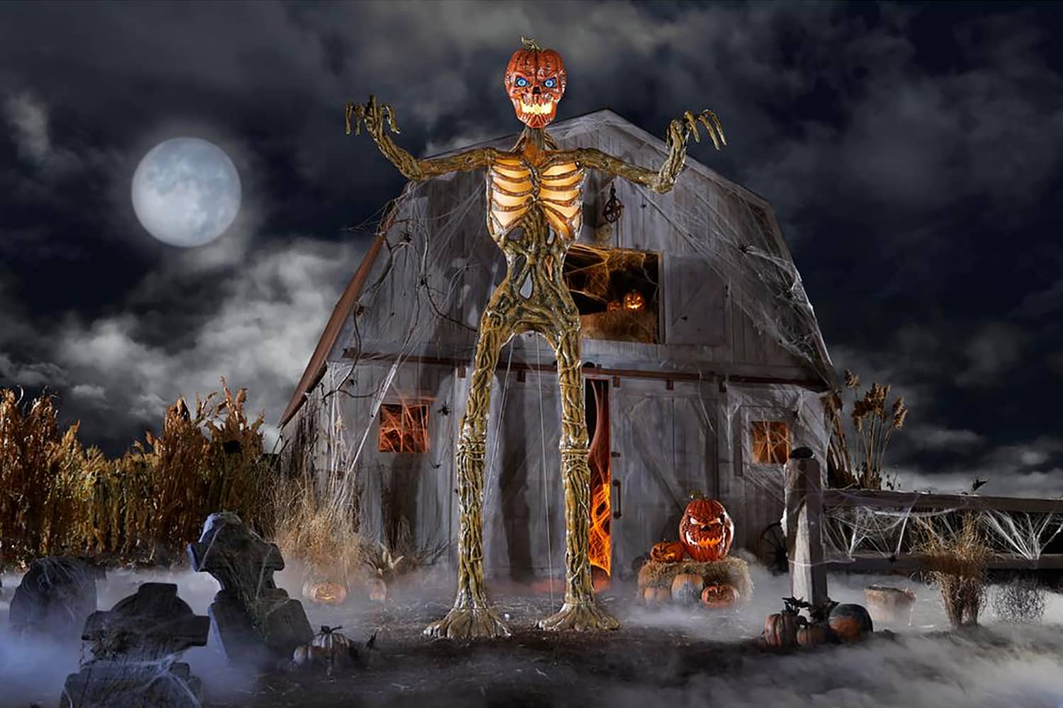 If you thought the original 12 Foot Tall Giant Skeleton from Home Depot was terrifying and obnoxious in the best way possible, then prepare yourself, your poor neighbors, and your front lawn for this cool new 12 Foot Tall Giant Inferno Pumpkin Skeleton With Animated LCD LifeEyes. This monstrous skeletal creature stands 12 feet tall and looks like it just rose up from some horrifying demonic rotting pumpkin patch... in Hell. Not only will its immense and imposing height dominate your haunted home's outdoor Halloween decor (or indoors if you have enough room), it also has a scary Jack o' lantern head with animated LCD LifeEyes that eerily move around and look at the terrified trick-or-treaters below it and a chest and mouth that booth illuminate with a fiery flicker inside. It features a skeleton-esque gnarled vine body, creepy posable arms, and ground stakes to keep this great pumpkin beast from wandering around and scaring the neighborhood out of their gourds on windy Fall days. If you have a pumpkin patch to display him in, even better.