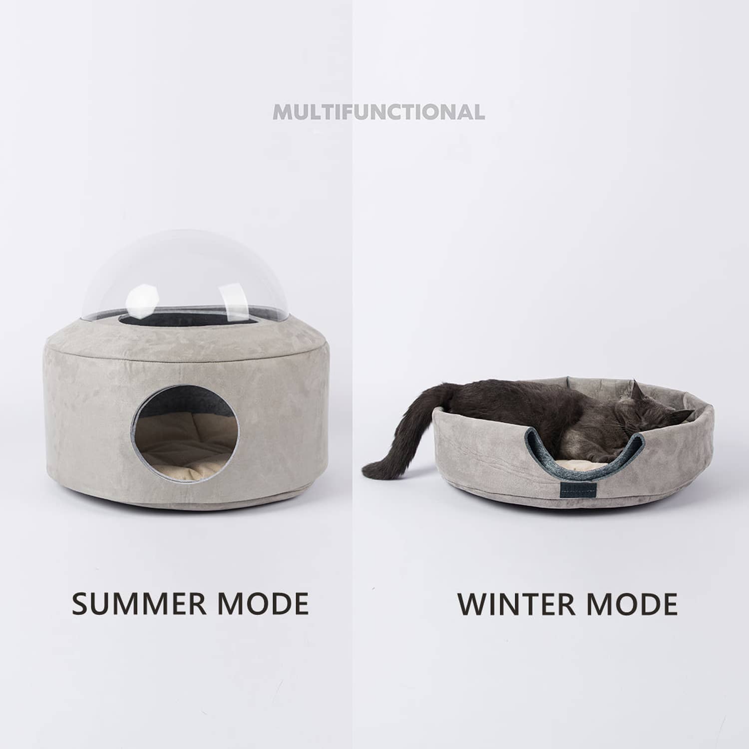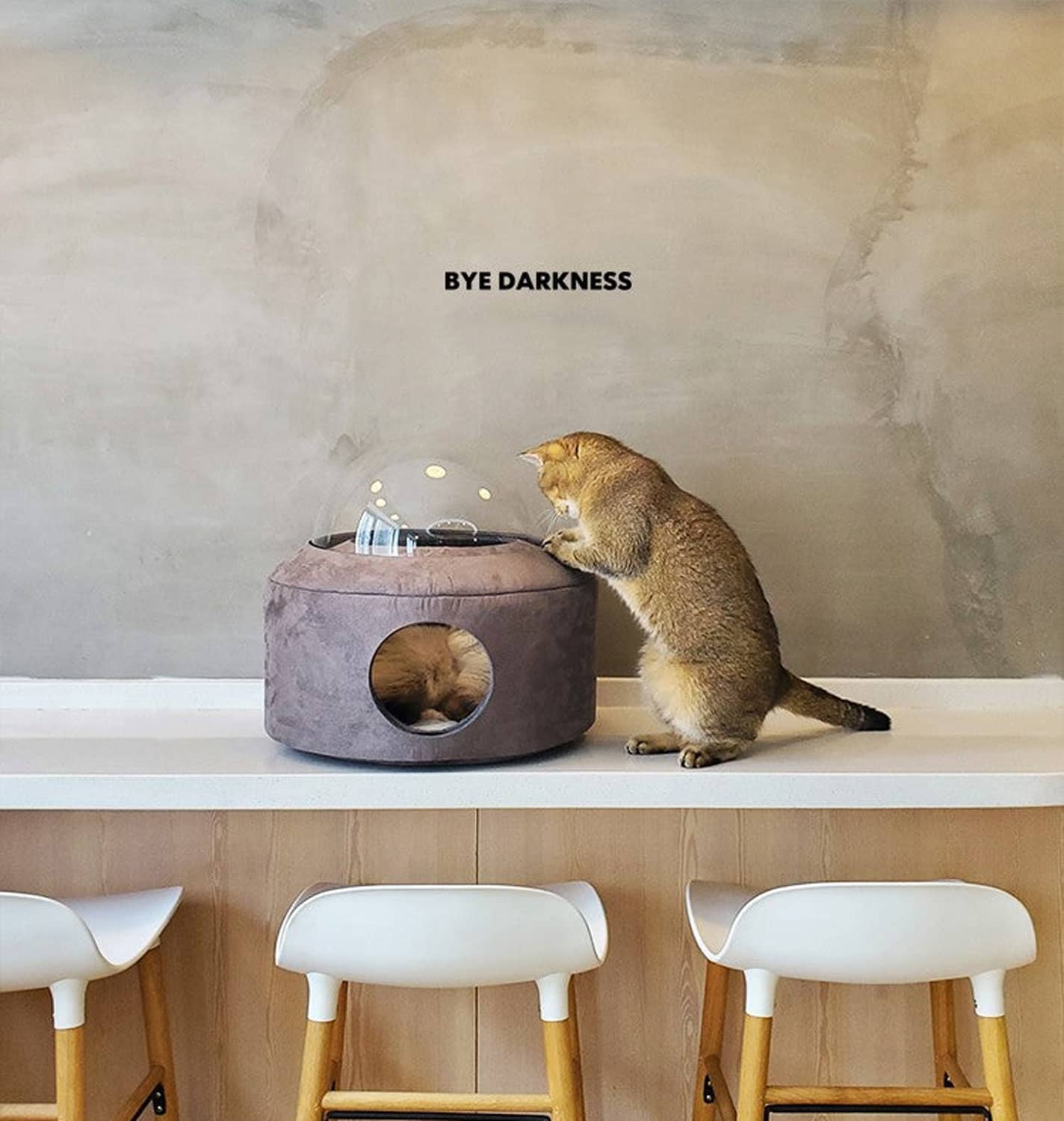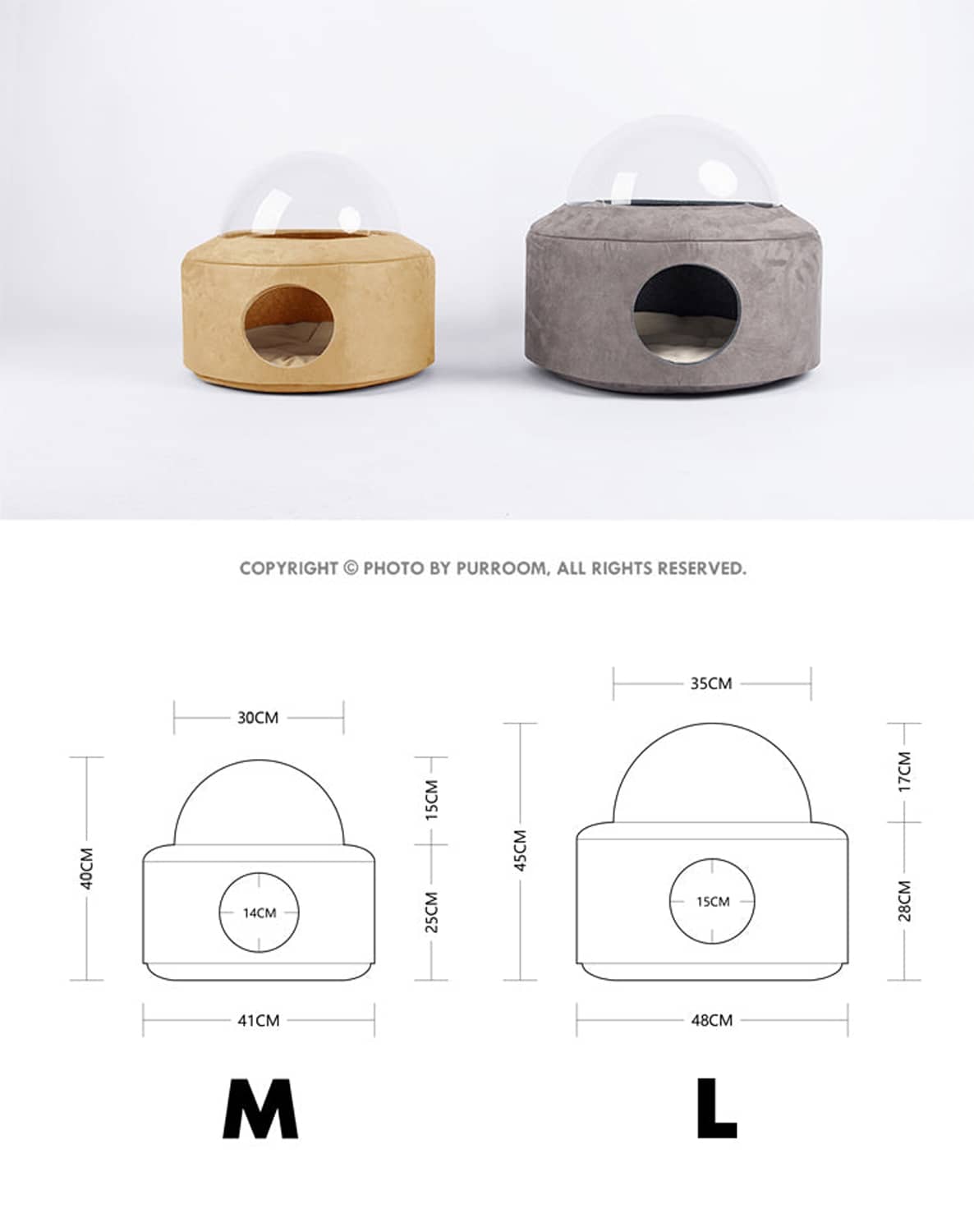 Does your pampered furry feline friend have their own spaceship yet? This cool new Space Capsule Cat Bed from Purroom is a miniature spacecraft / pet bed for cats from outer space (and Earth) that has a transparent acrylic dome on top for them to safely obverse the universe around them. It comes in two sizes and features a suede exterior in either dark grey, light grey, or orange and a cotton linen interior cushion.