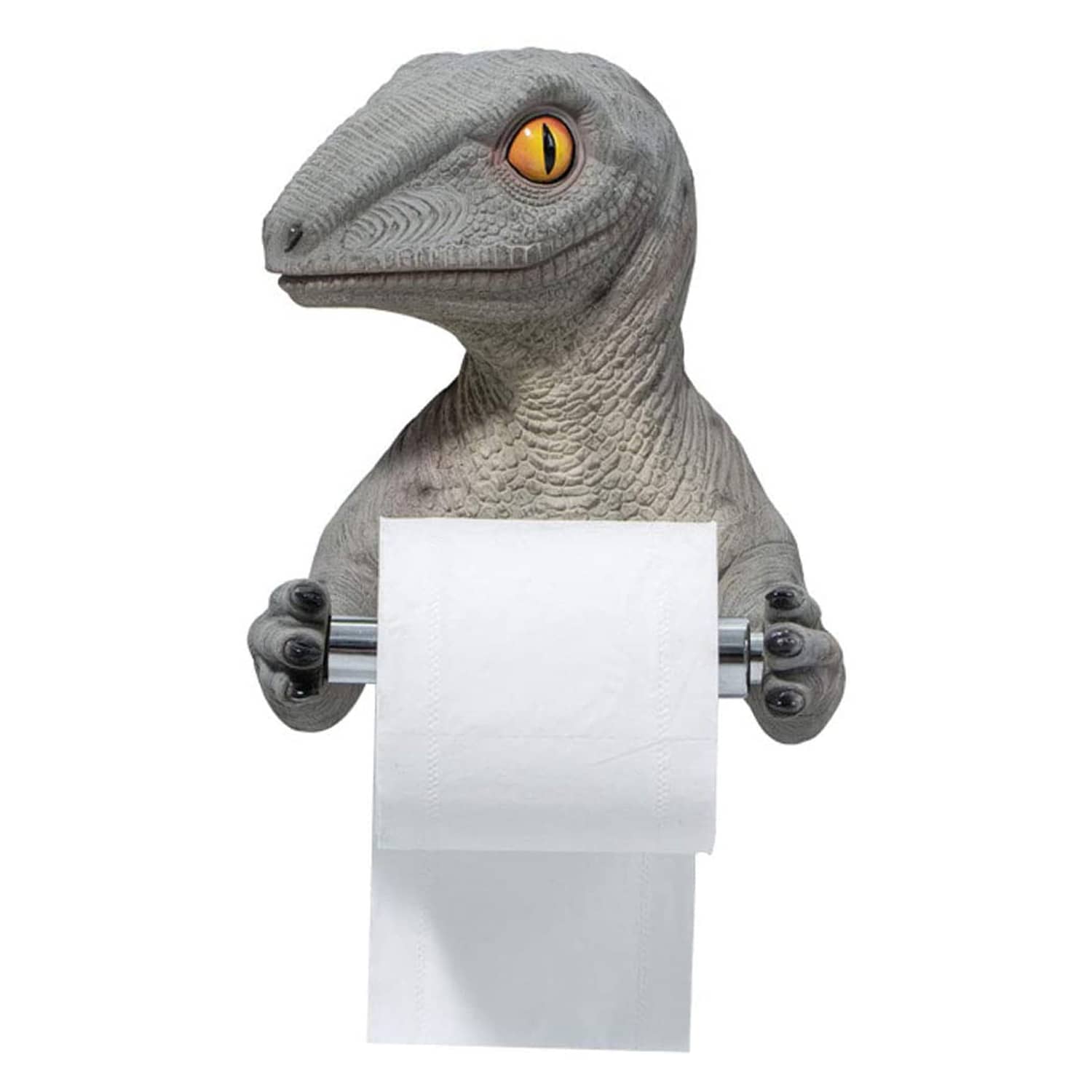As soon as you sit down on the can, you'll know you're in trouble as this cool new yet quite prehistoric Velociraptor Toilet Paper Holder stares you down as it guards the only roll left in the bathroom. It's the perfect Jurassic-inspired wall-mounted toilet paper holder for paleontologist bathrooms, dinosaur lover bathrooms, or definitely in dinosaur theme park visitor restrooms.