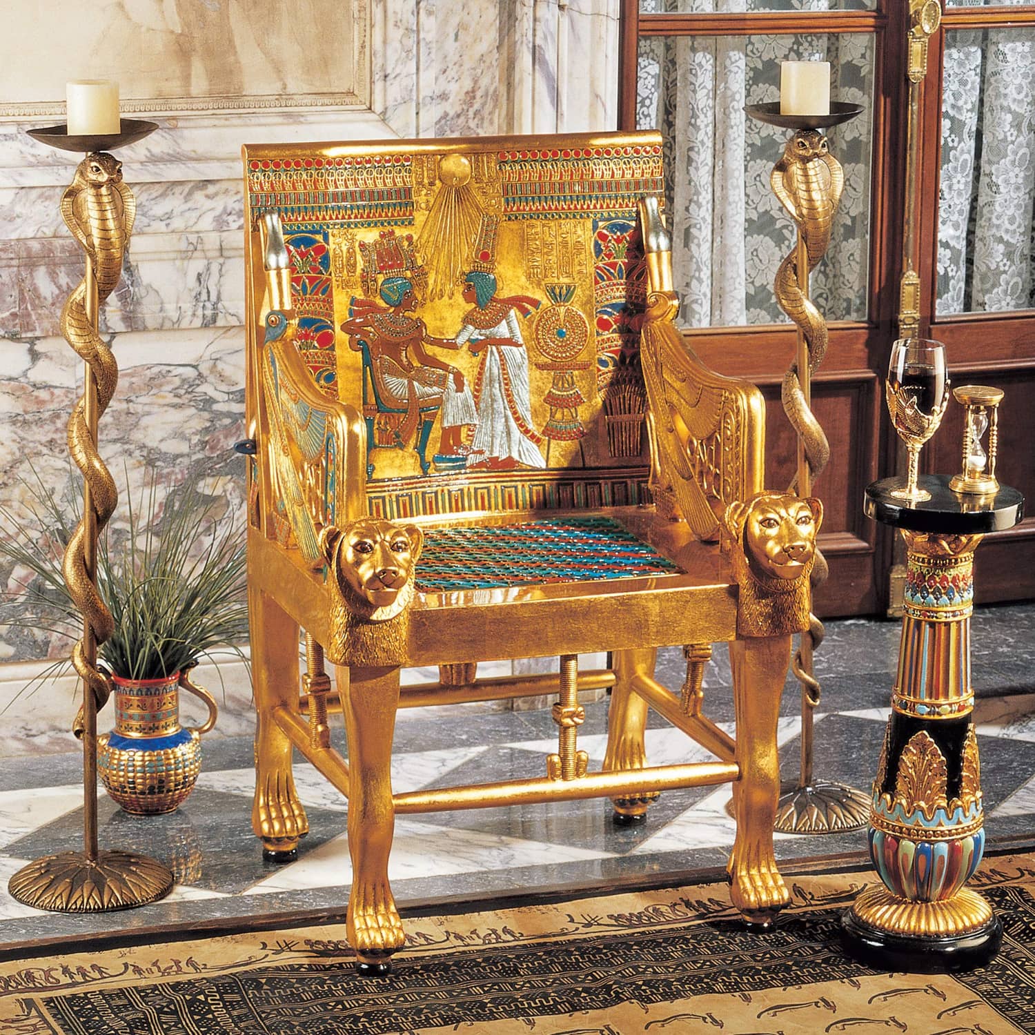 Want to sit like a king or, better yet, a pharaoh? Why not both!? This cool new yet quite ancient-inspired King Tutankhamen's Throne Chair from Design Toscano is a full-scale replica of King Tut's majestic golden throne chair discovered in his tomb in the Valley of the Kings by excavators led by Howard Carter in 1922. While the original 3,500 year old throne was crafted from wood covered in gold, this replica is made from high quality designer resin instead and then painted in realistic detail. So while it's not made from actual gold, it will still make a stunning addition to your ancient Egyptian themed home, office, pyramid, or burial chamber in your future tomb. Best of all, it's not even cursed! It also pairs nicely with this equally cool Lifesize King Tutankhamun Sarcophagus Cabinet.