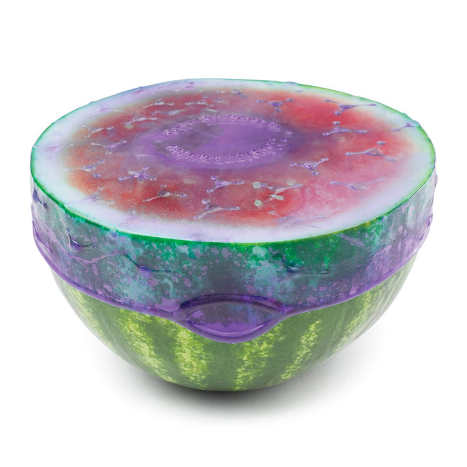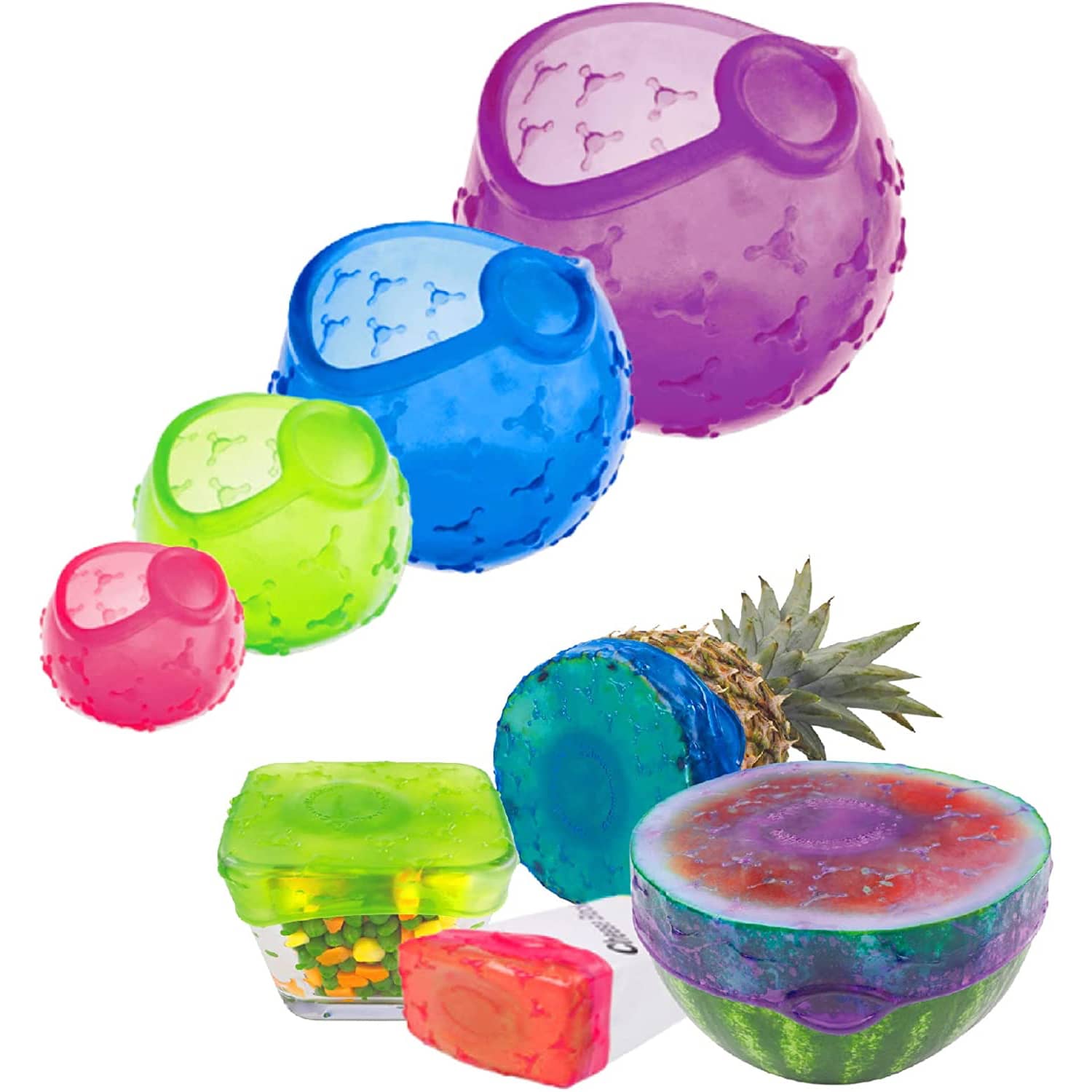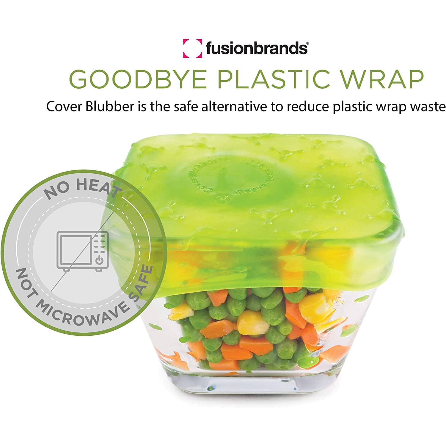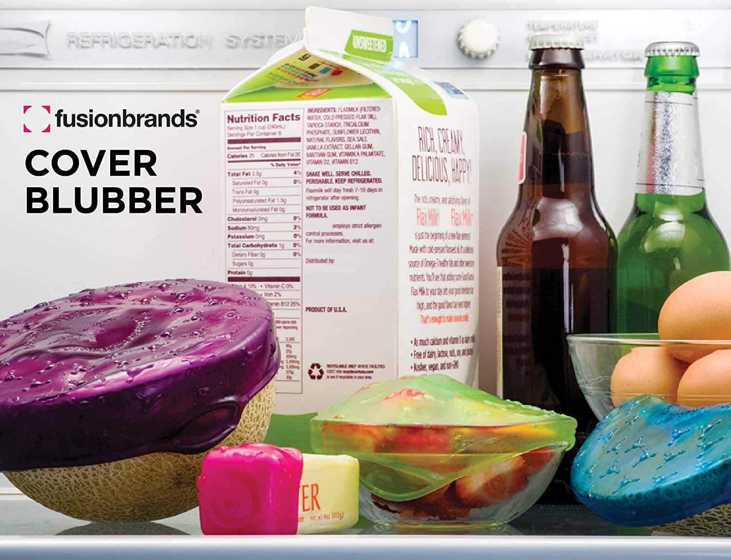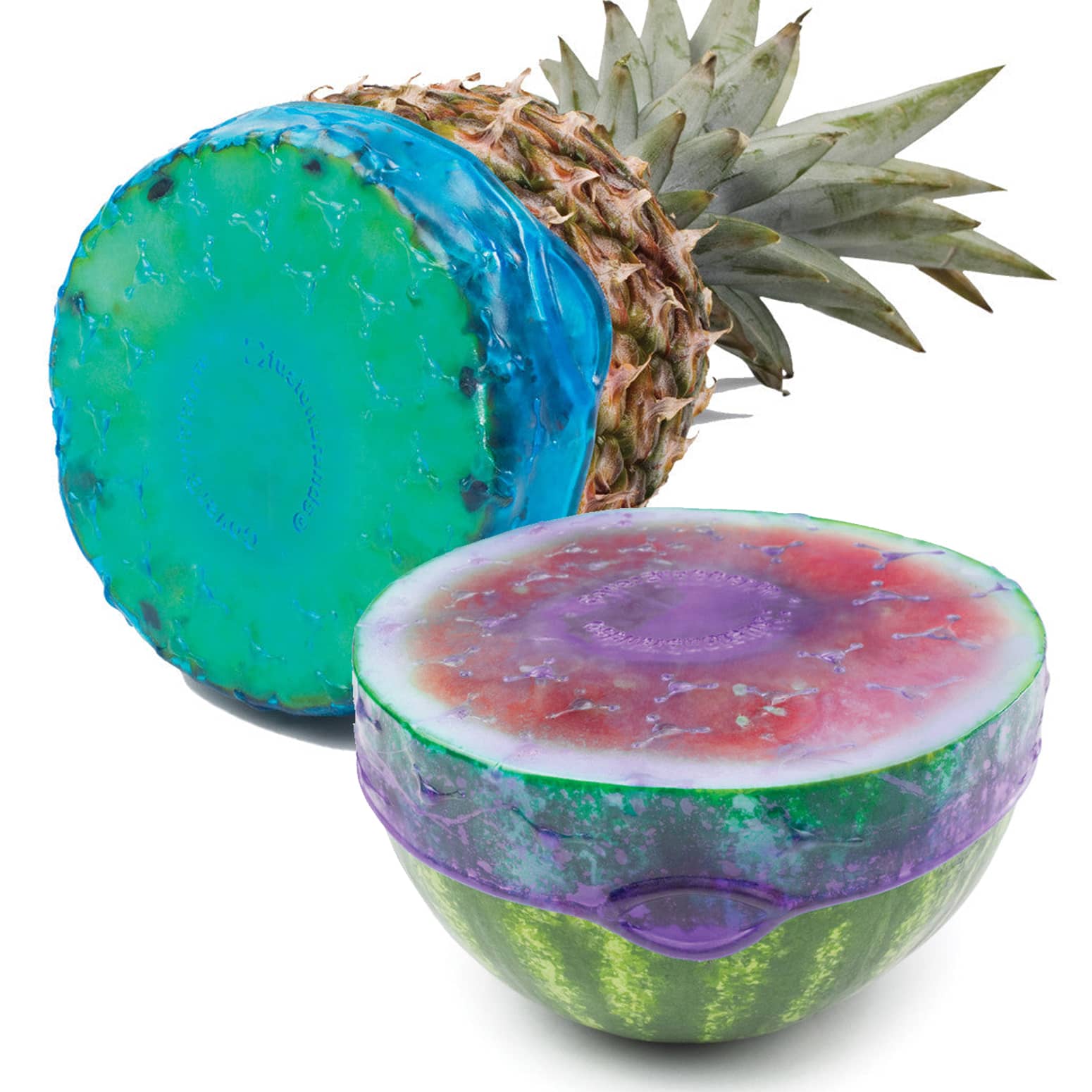 These cool new Fusionbrands CoverBlubber Food Savers are reusable, eco-friendly alternatives to plastic wrap stretch, cling, and create an airtight seal over fresh cut foods, dishes, and containers. Like tiny shower caps, these convenient wraps are made from food-safe, BPA- and phthalate-free silicone and are refrigerator and freezer safe. They come in a set of 4 different color-coded sizes that fit over things up to 12". Great solution.