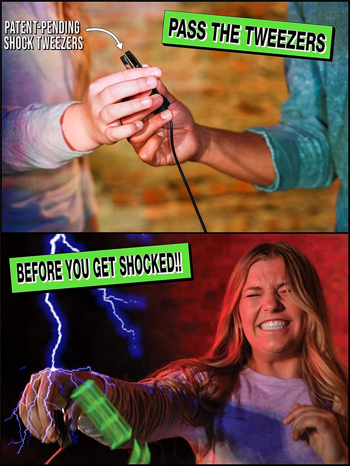 If the regular wooden block stacking game makes you nervous, then your nerves will be literally shocked to a new level with this cool new ShiZap! game. This terrifying tumble tower game gives off random electric shocks as players try to carefully move translucent blocks to the top with metal shock tweezers. When it's your turn, act quickly to move a block to the top without getting zapped and then pass the tweezers off like a hot potato. If you're unlucky enough to get the jolt, you must bear through the pain to finish your move and continue on. It features an LED illuminated base and three levels of intensity: zip (low), zap (medium), and ShiZap! (high).β‘οΈπ±