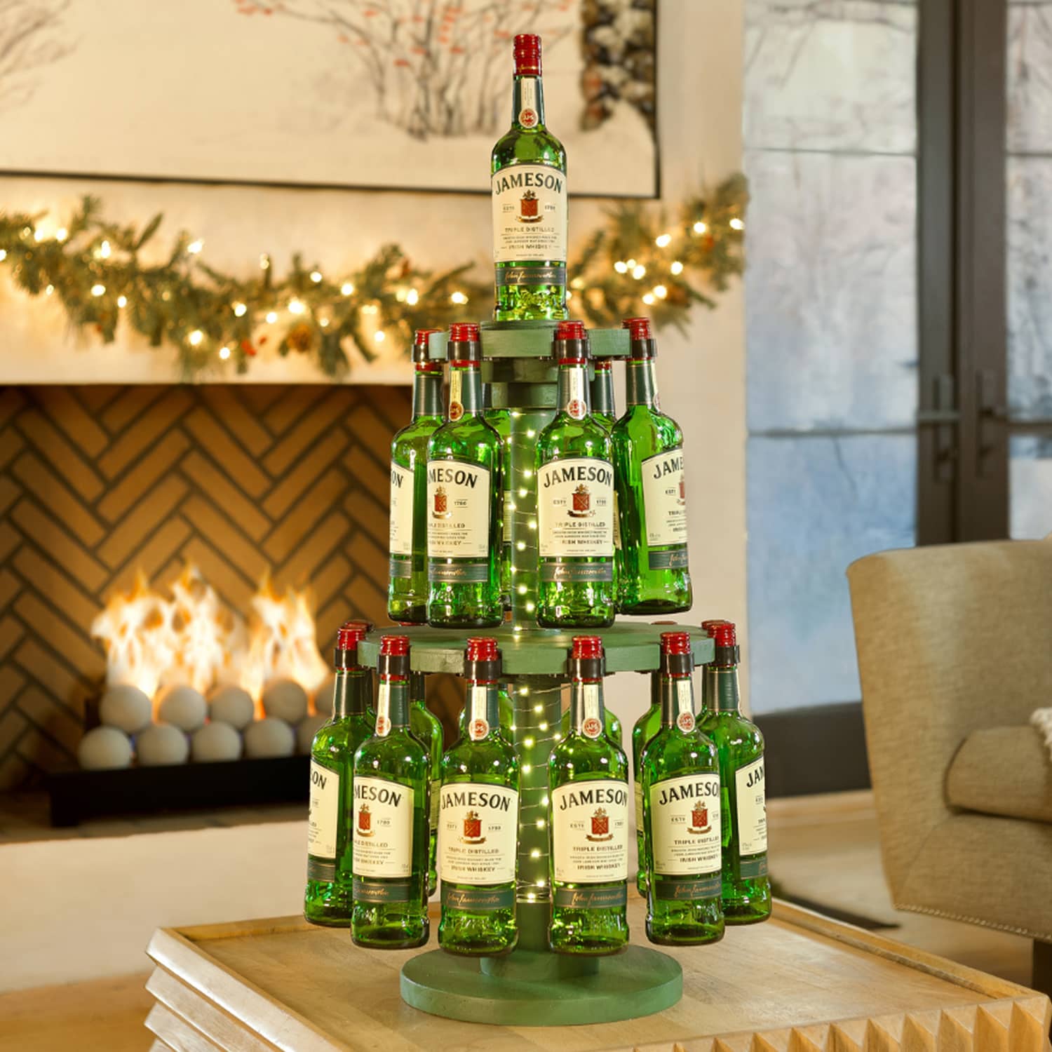 Need some extra Christmas spirit to help get you through the holidays this year? Well, there's no better spirit than Irish Whiskey, so pour a glass, relax in front of a crackling fire, and gaze upon this cool new Jameson Whiskey Tabletop Christmas Tree in your front window where all the world can see. This fun and festive miniature tabletop Christmas tree is actually a pre-lit wooden stand that holds and includes 19 dummy bottles of Jameson Irish Whiskey(750ml) in the shape of a lush evergreen. Thankfully, it also includes a full bottle of Jameson Black Barrel (750ml) as well. Please enjoy Jameson Irish Whiskey and decorative booze-inspired Christmas trees responsibly. π₯π