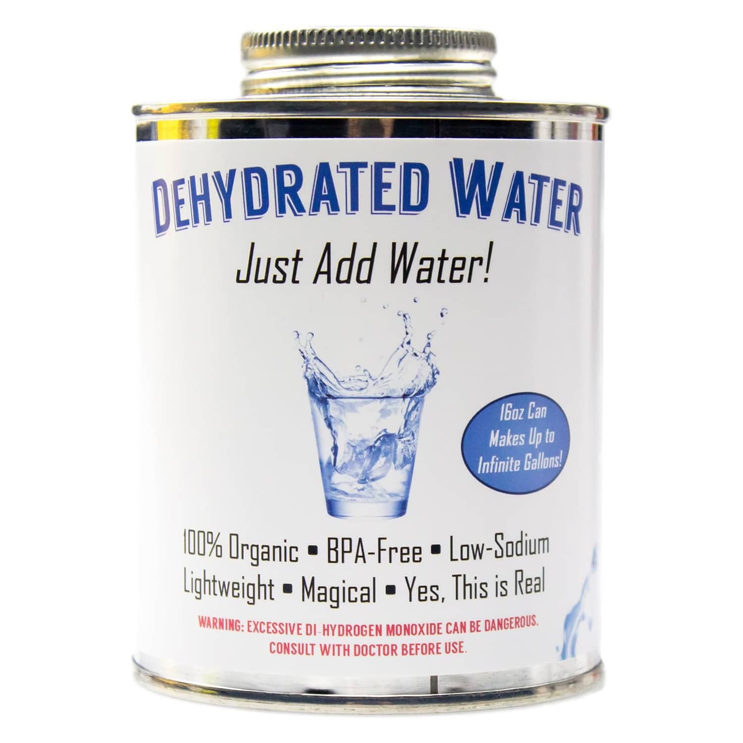 Stay hydrated! Don't forget to drink water! Are you tired of hearing these two phrases... everywhere... all of the time? It seems like we now live in a post-information-age of mass stupidity where apps and constant reminders are needed to inform the excessively parched to take a simple drink of water when they're thirsty. The rest are carrying around giant bottles of water just in case they accidentally get lost in the desert and their smartphone, smartwatch, or smart something else dies and leaves them helpless to know when to take a lifesaving sip. The better solution is to simply stock up with a few cans of this cool new Dehydrated Water.