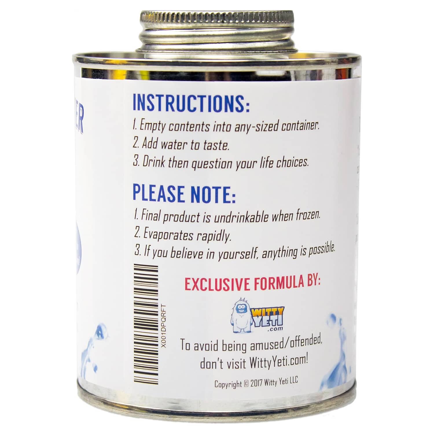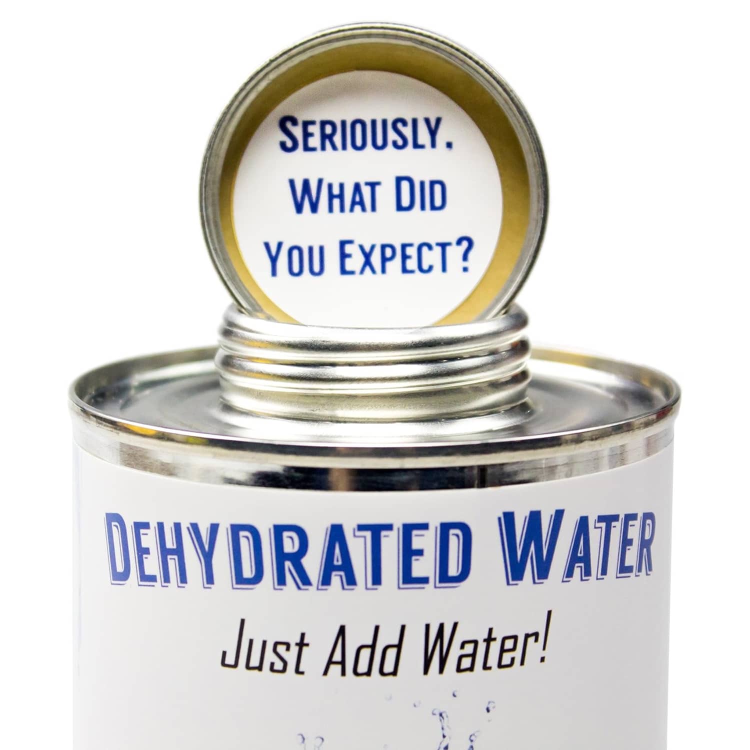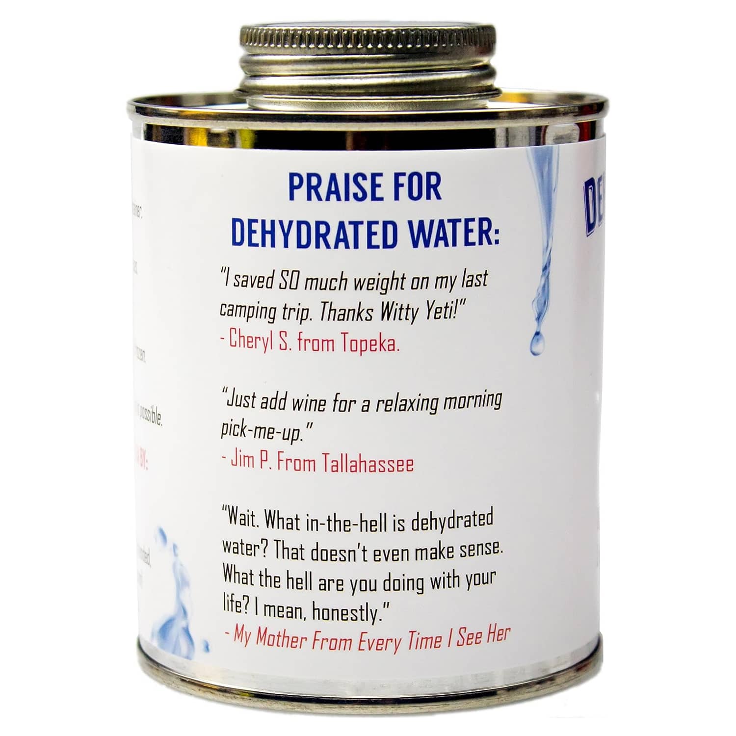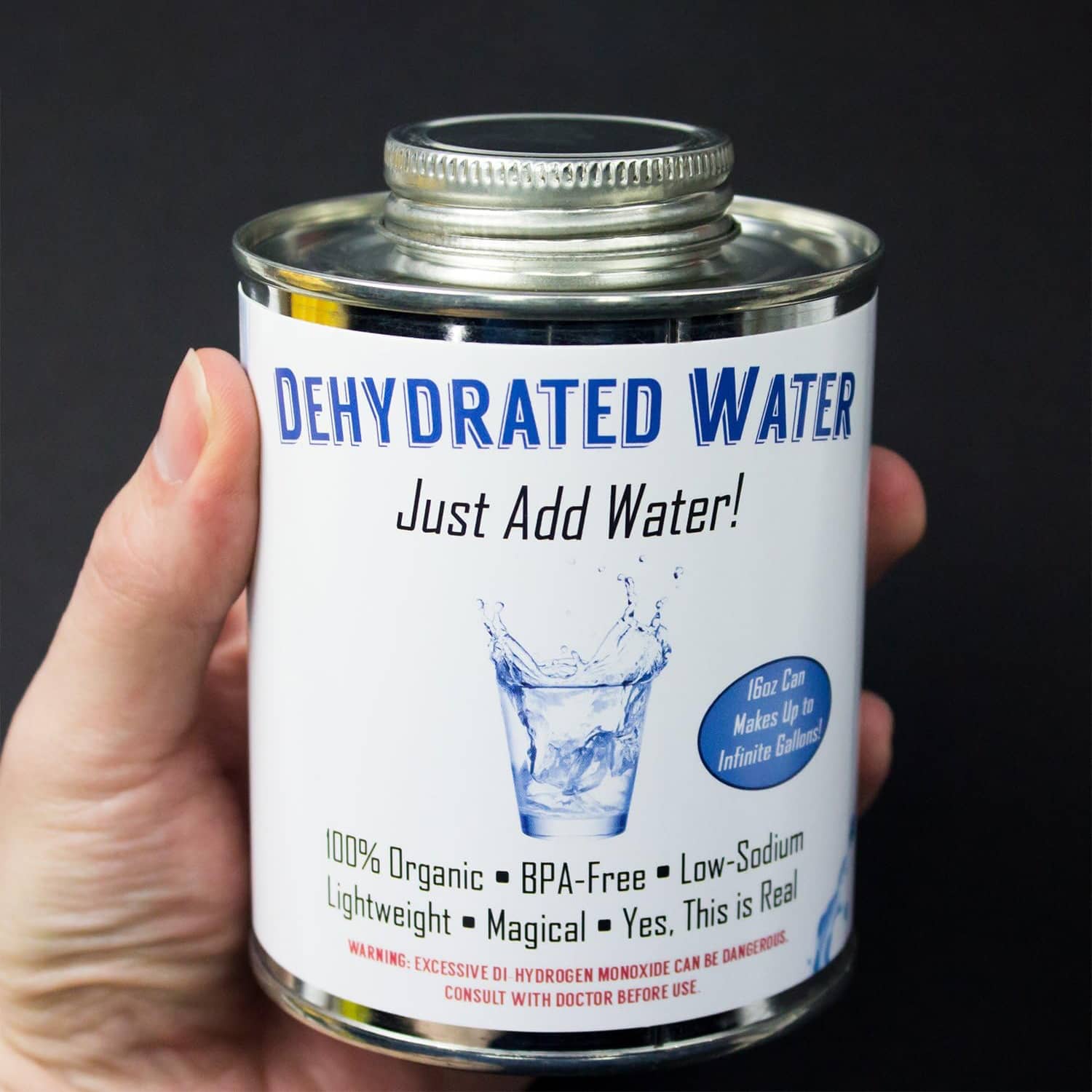 To make infinite gallons of water, just unscrew the cap on the steel can, mix in equal parts of this dehydrated dihydrogen monoxide with pure water, and then chug it before you instantly dry out and blow away. The final result is 16 oz per can of 100% organic, BPA-free, gluten-free, Vegan-friendly, eco-friendly, cruelty-free, low sodium, and plastic straw-free rehydrated water. Since the bulky water has been removed beforehand, it can be more easily carried while hiking or camping and will even stay fresh forever in a prepper's emergency survival supply. It also makes a great gift for anyone with an unusually mighty thirst and is sure to be a hit in a white elephant gift exchange. It also pairs nicely with a refreshing can of Perri-Air when your phone forgets to tell you to breathe too.