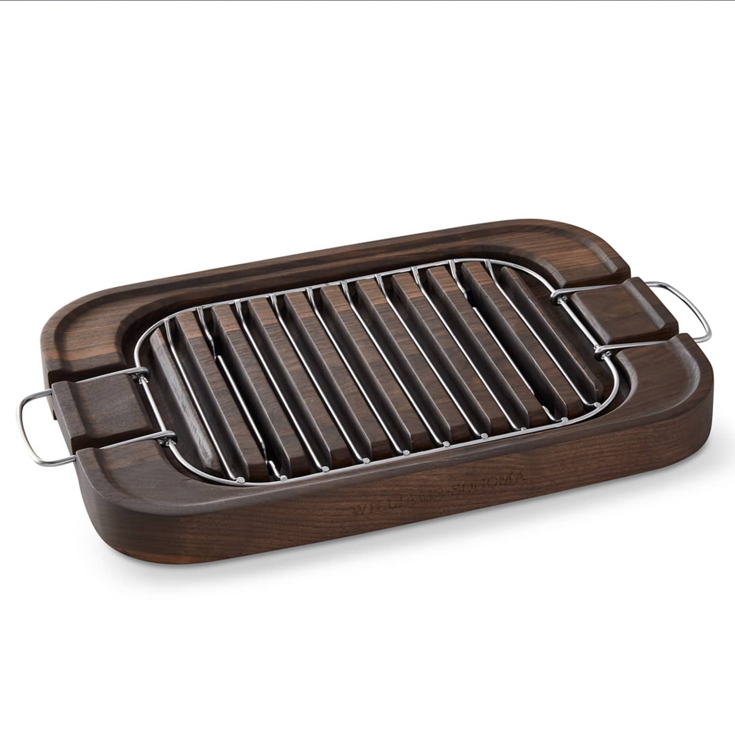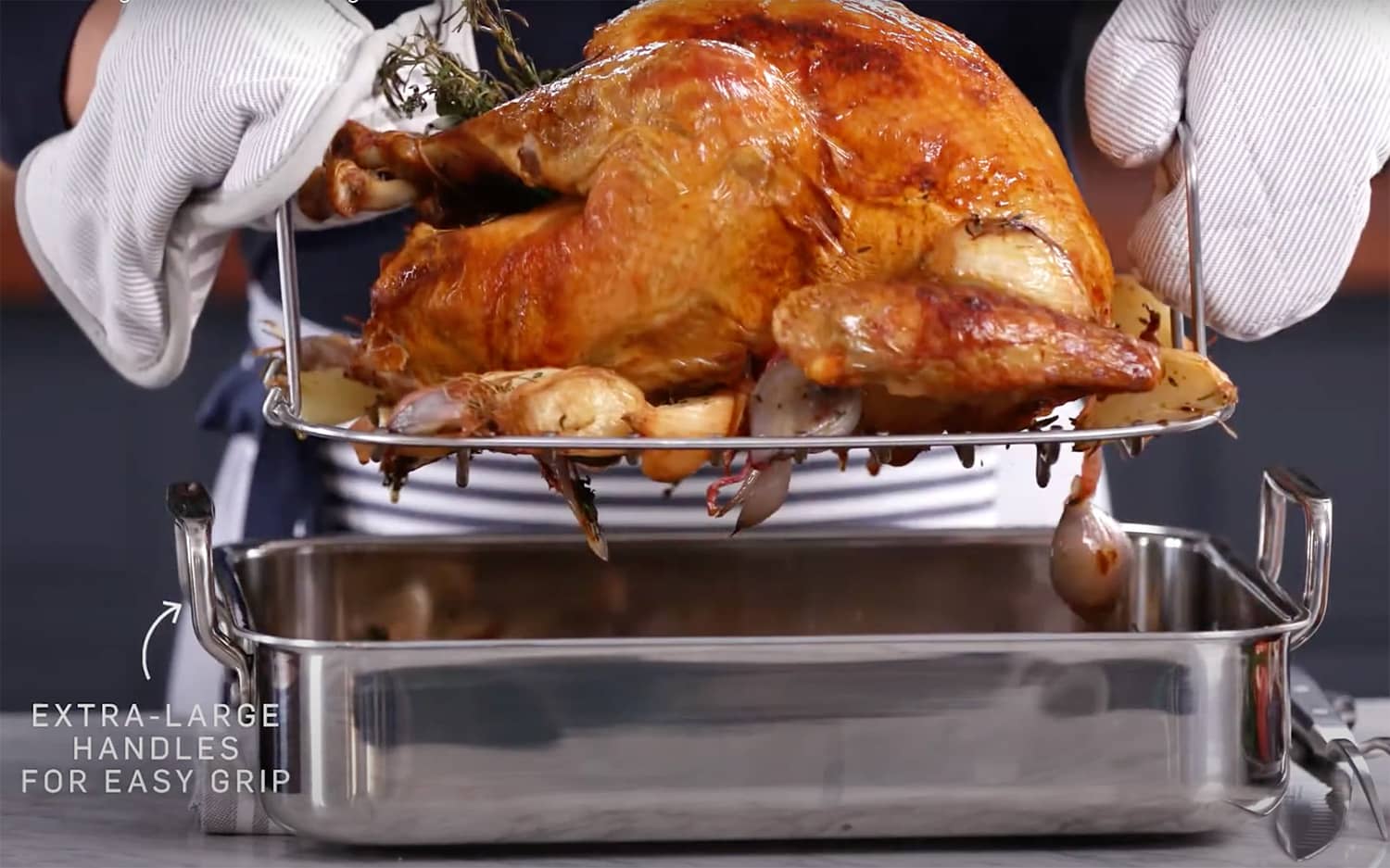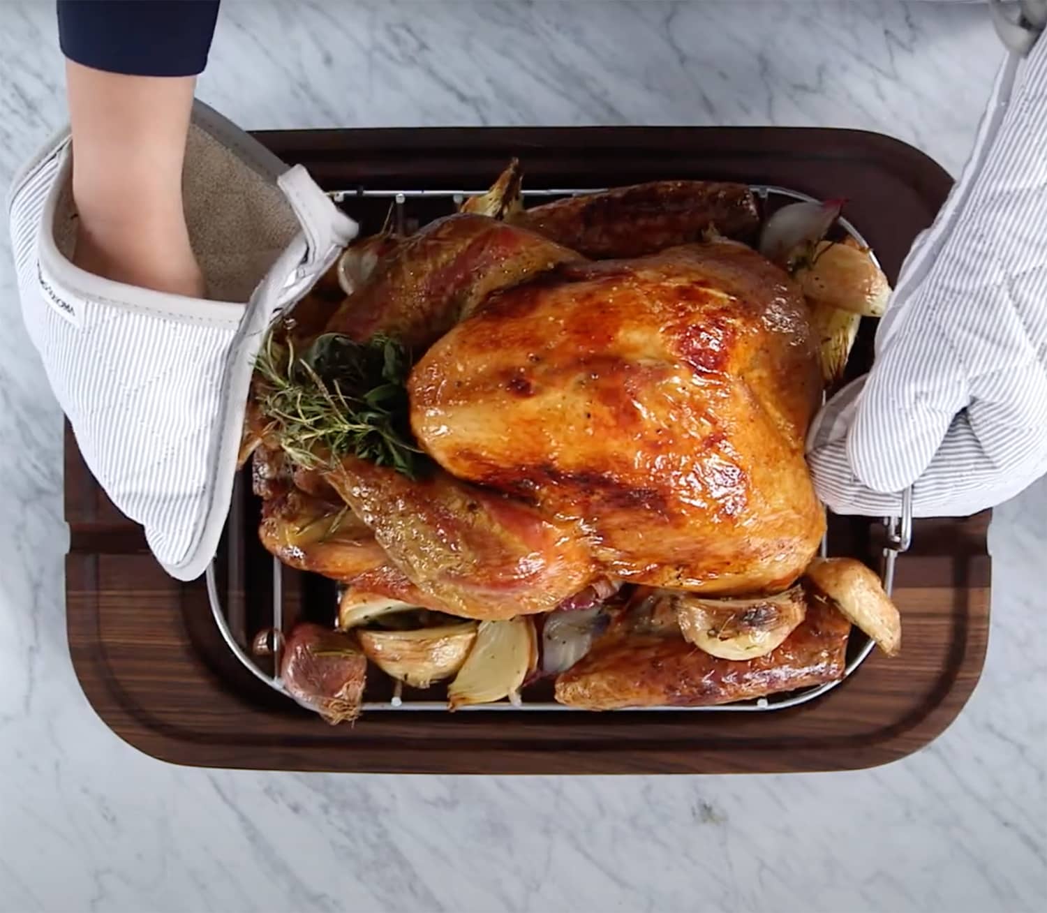 This Thanksgiving, transfer your turkey from a roasting pan to the carving board with ease using this cool new Ultimate Carving Board. Just place your turkey or other meats onto the stainless steel slatted rack, place it in a roasting pan and cook in the oven, and then use the lift handles to transport the rack back to the slatted American black walnut carving board to rest. It features indents to allow drippings to drain off and it can even be flipped over to use as an elegant serving tray for cheeses and other assorted appetizers. Check out the video below to see it in action. π¦