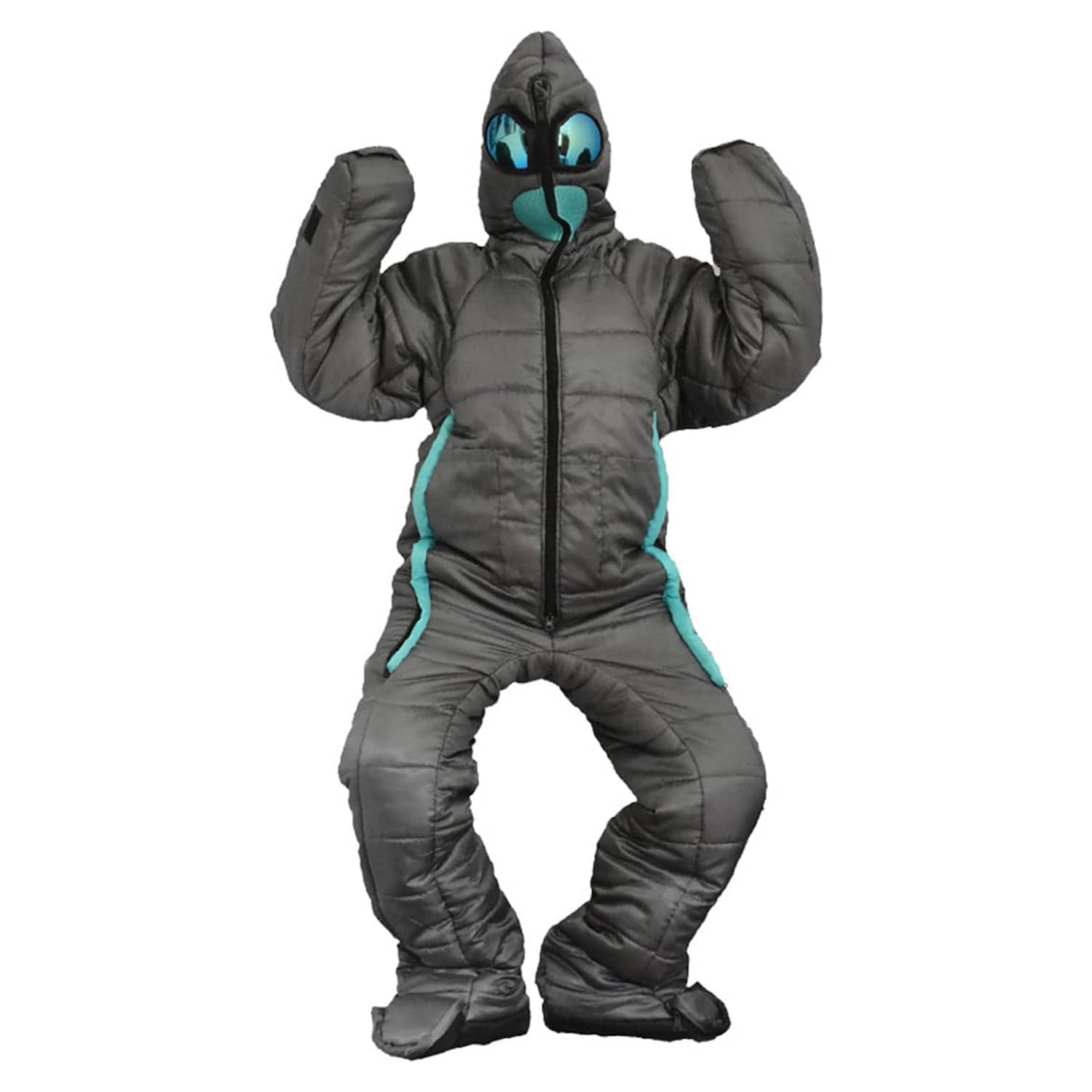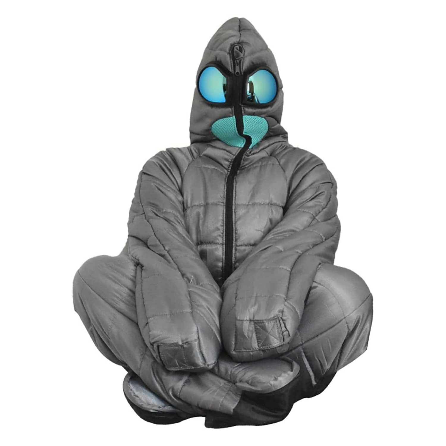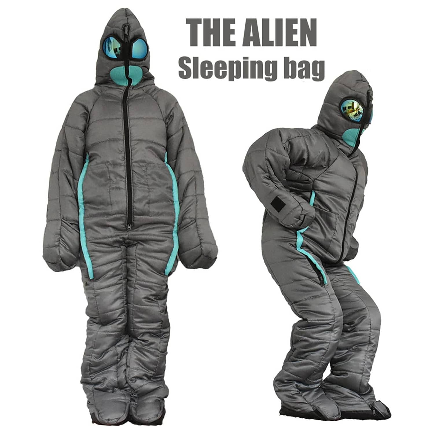 This cool new The Alien Sleeping Bag is a wearable full-body sleeping bag that transforms you into a humanoid grey alien from Zeta Reticula visiting Earth on an intergalactic camping trip. After you slip into this comfy warm sleeping bag, you'll be able to freely walk around without taking it off and you'll get the added bonus of giving anyone who notices you an alien visitor sighting story. It features a soft polyester lining with filling, a convenient double-sided zipper, easy access hand openings, removable booties when you want to walk around in shoes, two side pockets, and alien eye lenses to help you see out. It's perfect for outdoor camping, tailgating, travel, sleepovers, or just hiding comfortably in plain sight if you happen to be an actual extraterrestrial visitor. π½πΈ