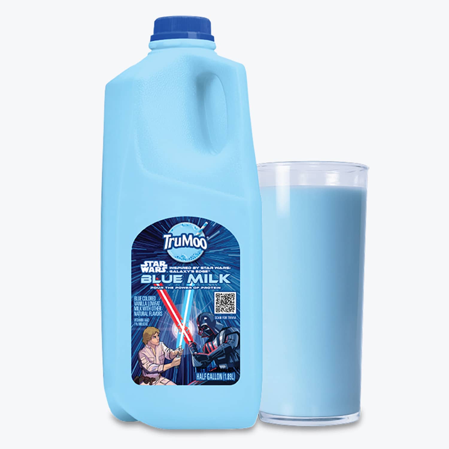 If you always wanted to try blue Bantha milk from planet Tatooine, now you can with this cool new yet from a long time ago-inspired TruMoo Star Wars Blue Milk. While this blue milk is not made from real blue Bantha growth fluid (the hyperspace shipping costs would be way too high), it is made from 1% low-fat milk from Earth cows that's been dyed the perfect shade of galactic blue and flavored with vanilla. It's perfect for adding to Kellogg's C-3PO's Breakfast Cereal and available for a limited time only.