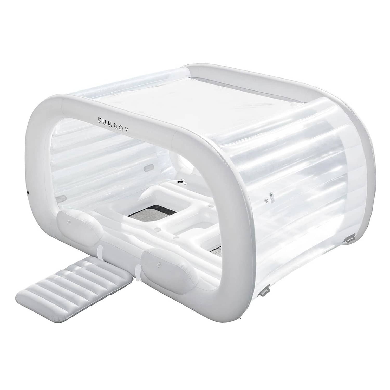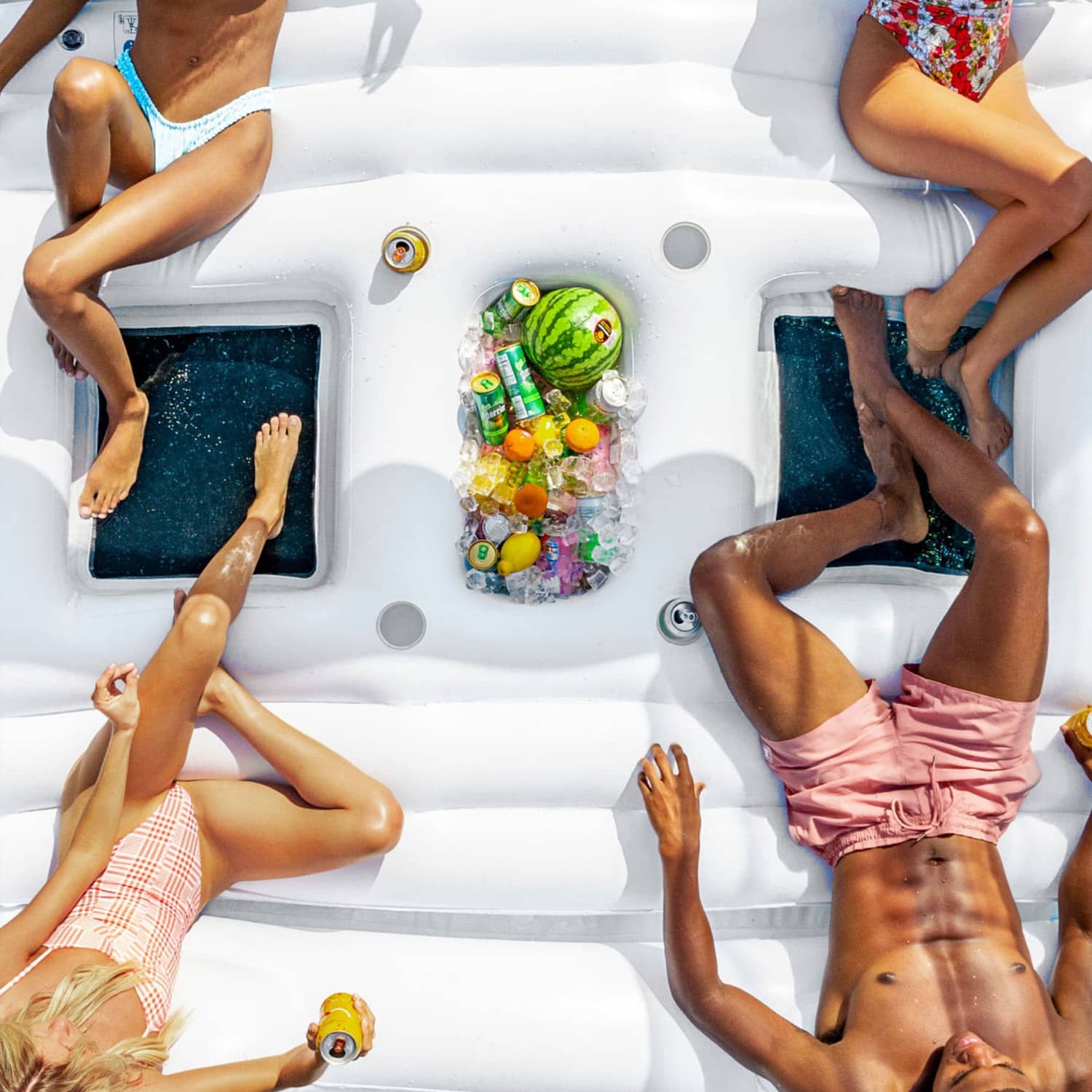 Create your own floating island of lazy leisure with this cool new FUNBOY Cabana DAYCLUB. This massive inflatable floating raft measures 10 feet long, comfortably holds up to 4 adults, and features a removable mesh sunshade, 2 mesh foot-baths, 4 cupholders, a central beverage cooler, perimeter grab ropes, 8 handles, and a mesh storage bag is also included. It's perfect for large pools, lakes, sandbars, or just making the most of a flooded backyard.