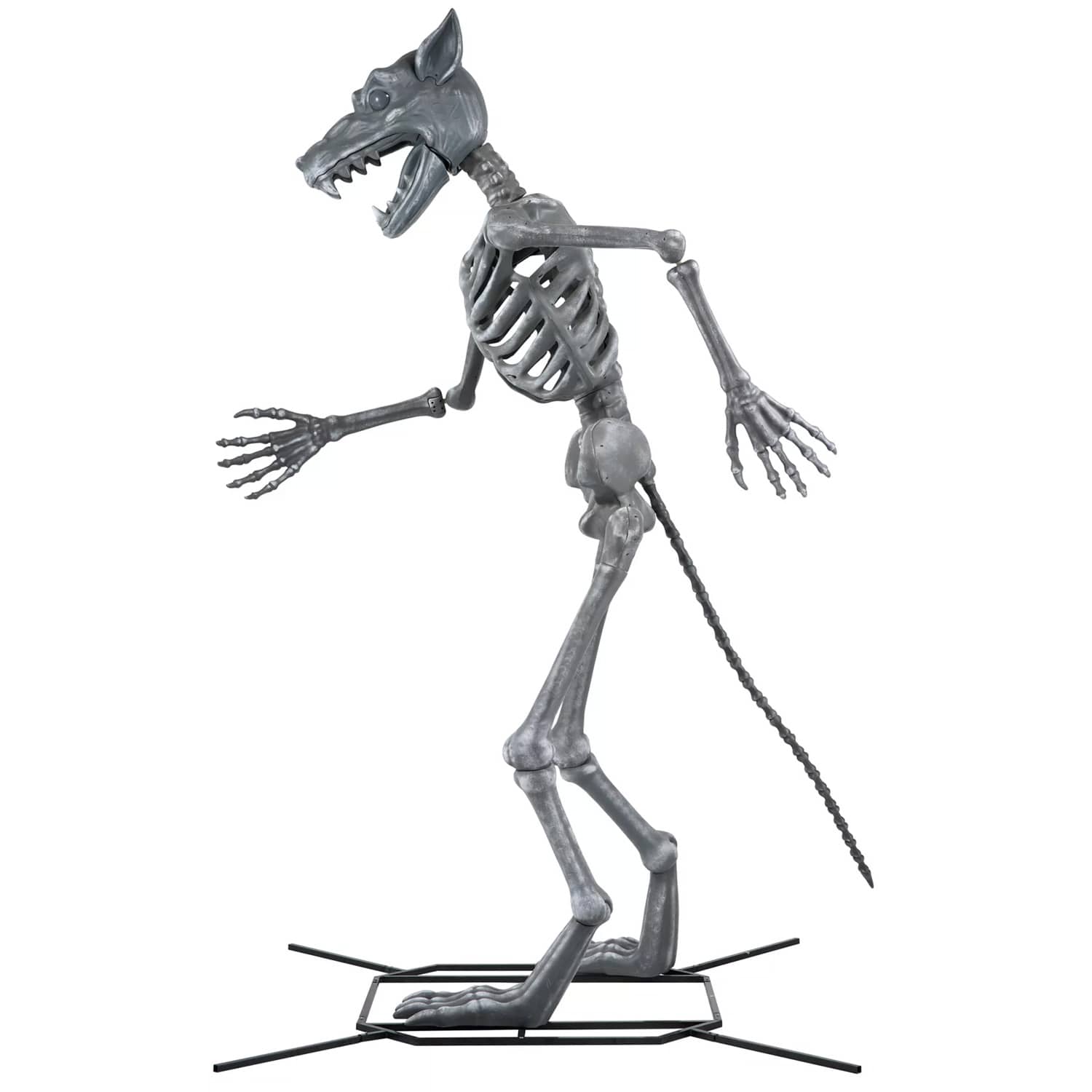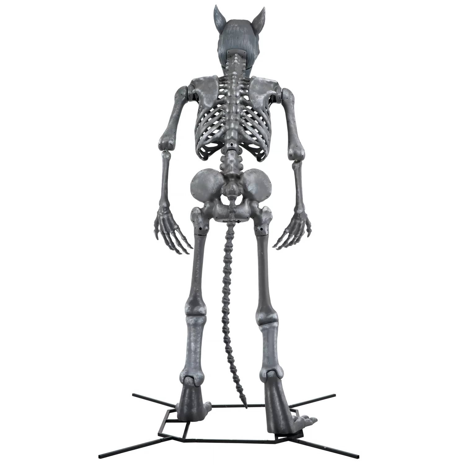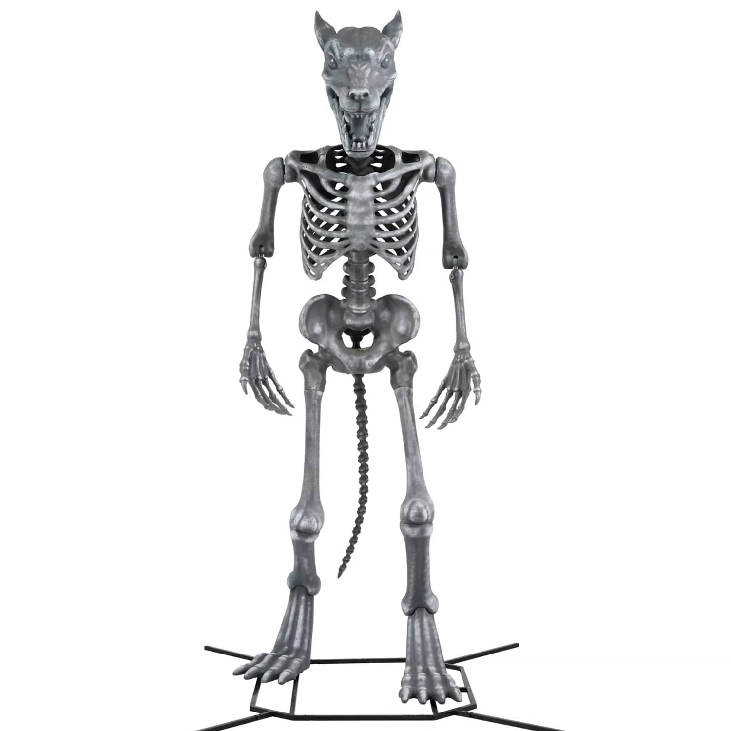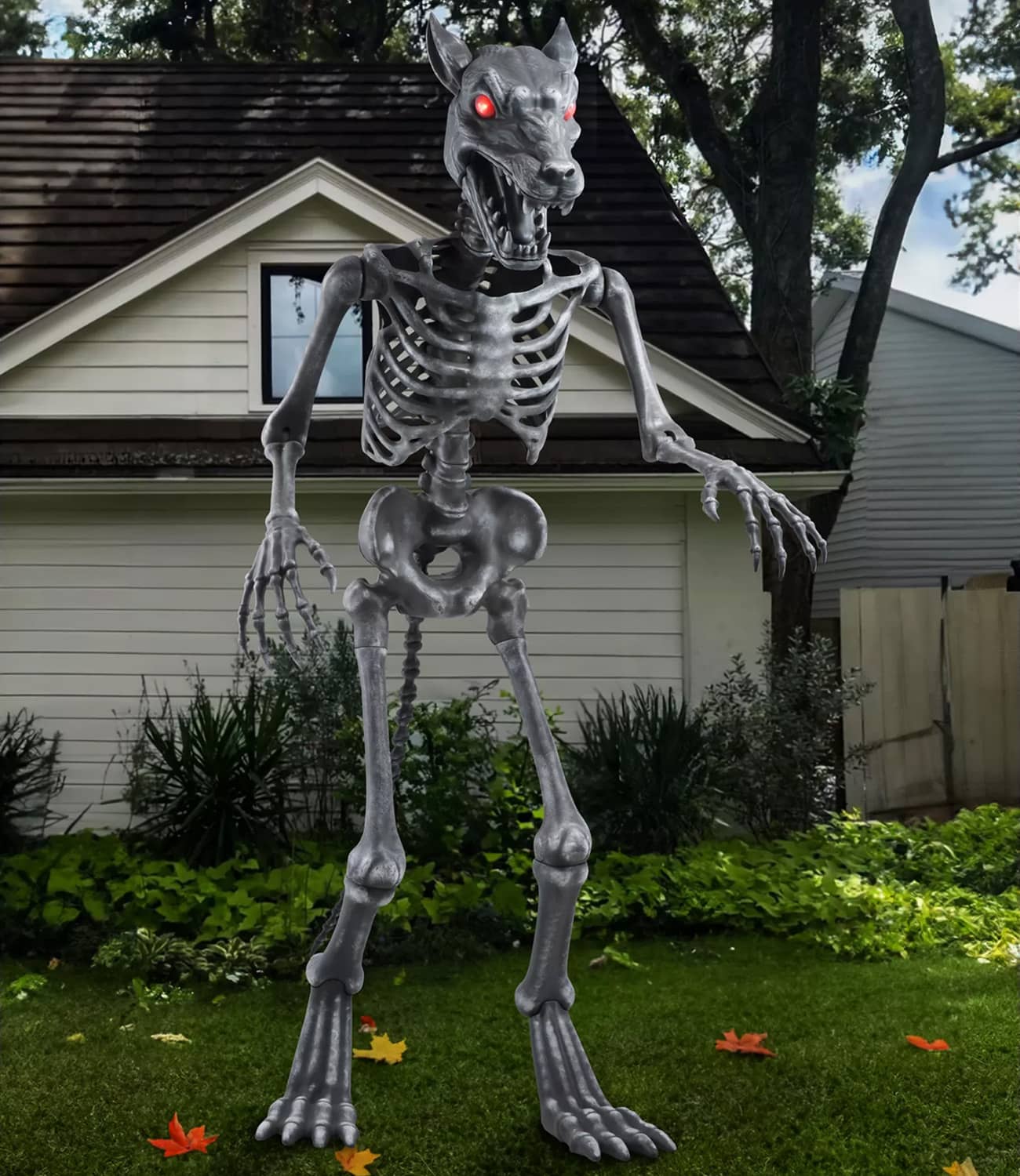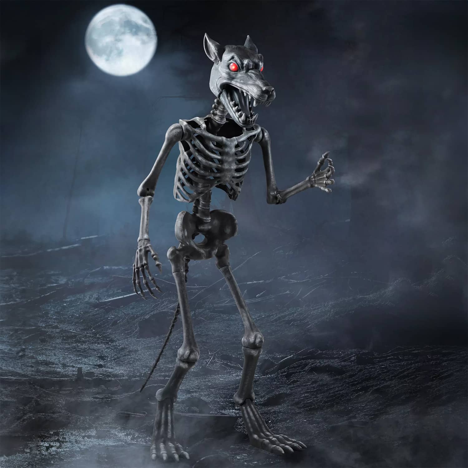 There are a lot of giant skeleton statues out there and a lot of giant werewolf statues too, but now you can have both, all-in-one, with this cool new Wolfie from Spirit Halloween. This gigantic animatronic werewolf skeleton statue stands 10-ft tall, howls and growls when a victim gets too close, plays spooky atmospheric music, has posable arms, and strikes fear into all who see its sinister glowing red eyes staring back at them in the darkness. It even has a long bony werewolf tail. Hmm, I bet the 10-ft tall human that transformed into this massive werewolf on a full moon must have been equally terrifying. πΊβ οΈπ