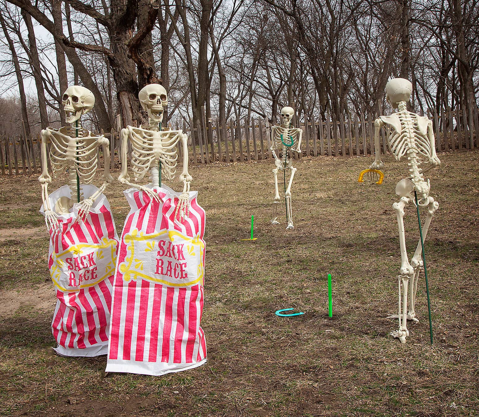 If you'd rather take a more whimsical, double-take-inducing approach to your Halloween decorating this year, then check out this cool new Halloween Skeleton Yard Games Decorating Kit. Make it seem like it's all fun and games for the undead to play on your front lawn with this kit that includes 4 posable plastic life-sized skeletons, potato sacks, and a 2-in-1 horseshoe and ring toss game. Once set up, it will look like two of the skeletons are having a sack race while the other two are playing a toss game. If nothing else, this is sure to give you similar ideas for endless other funny front yard skeleton poses. π