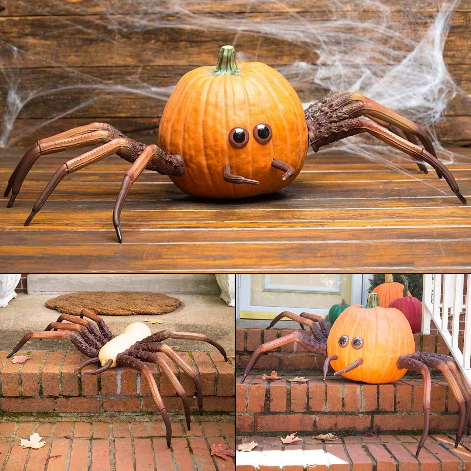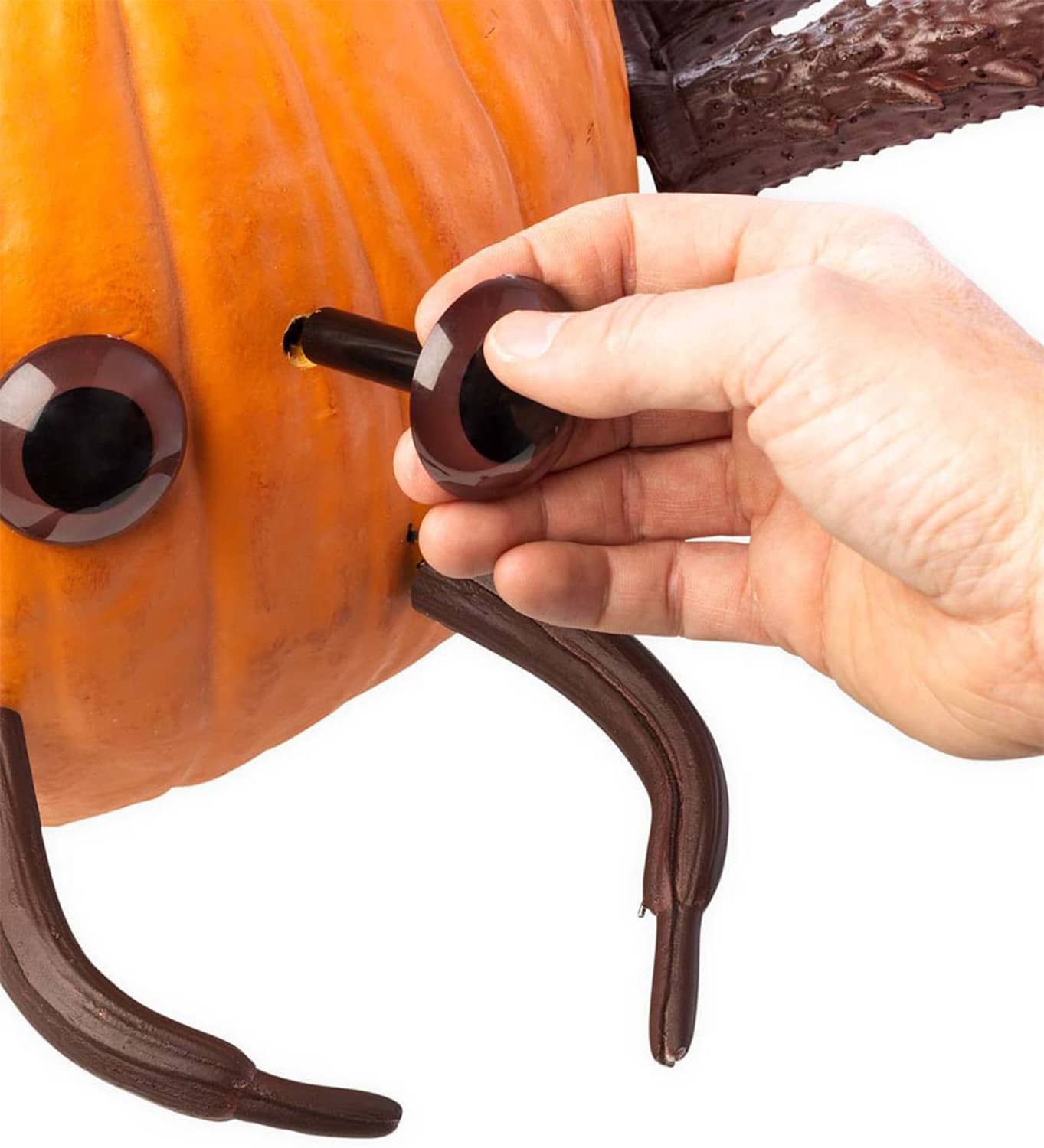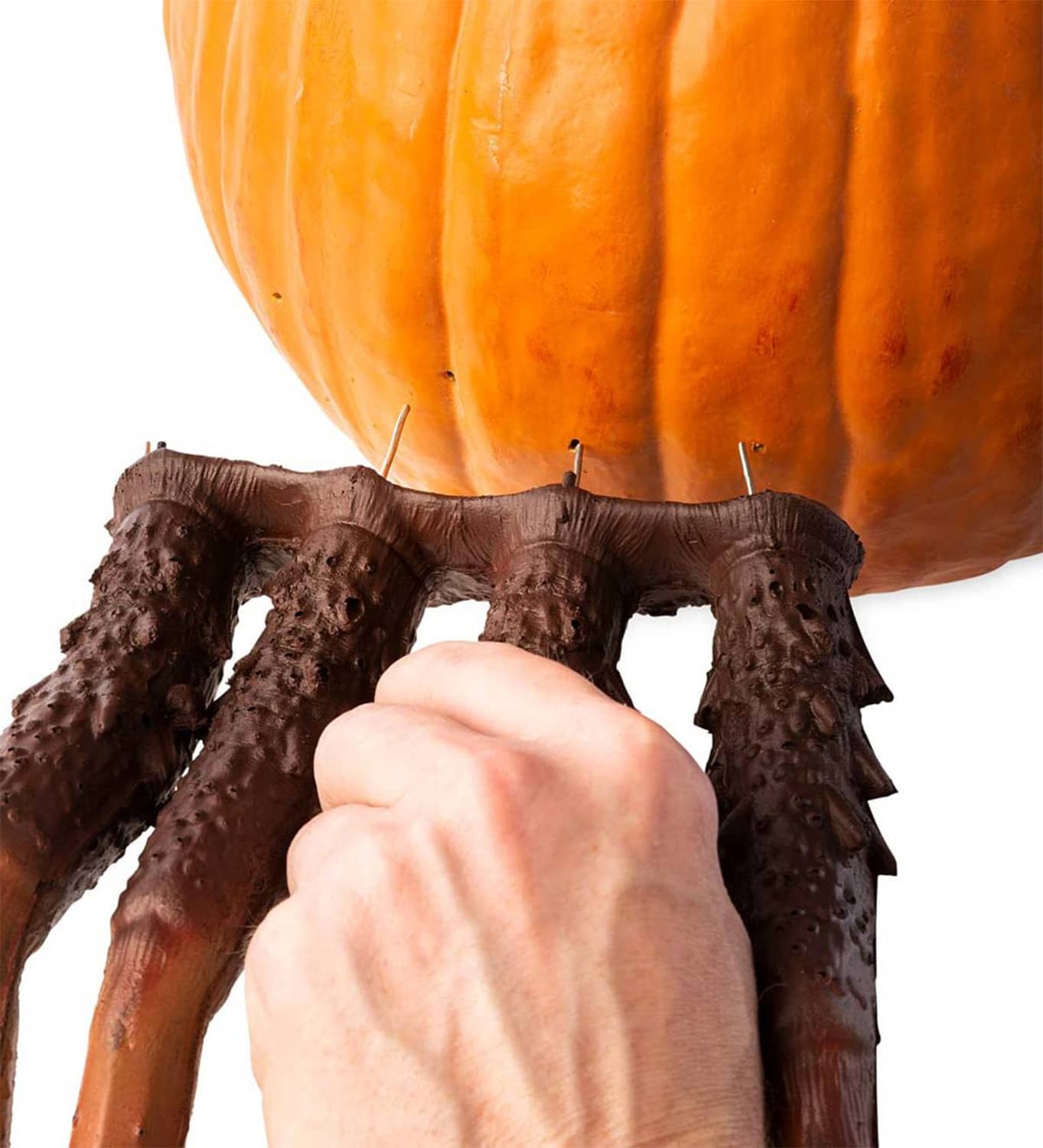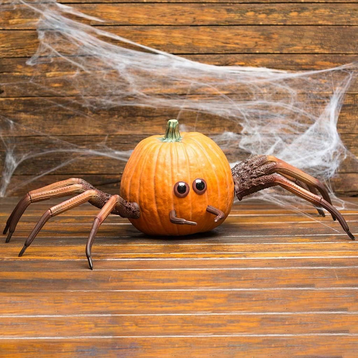 These cool new Halloween Spider Pumpkin Appendages from Plow & Hearth are a set of arachnid parts that instantly turn pumpkins, gourds, squash, and melons into terrifying 8-legged spiders! This reusable set includes 8 legs and 2 front feeler palps made from realistic-looking foam-covered wire that can be shaped for posing and two plastic googly eyes to complete the creepy crawly transformation. All of the parts have pronged ends to make them simple to push into and secure on the pumpkin. It's perfect for anyone who always wanted a giant spooky pumpkin spider, those tired of all the messy scooping and carving, or just anyone looking to confront and conquer their arachnophobia. It also pairs nicely with equally cool Pumpkin Vine Arms and Legs.