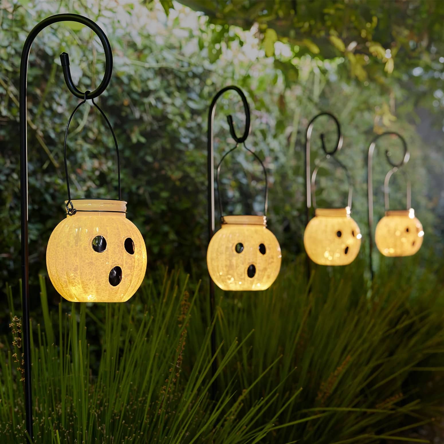 This Halloween, illuminate the paths around your haunted home in spooky style with these cool new Halloween Ghost Solar Pathway Lights from Balsam Hill. This set of 4 solar-powered LED pathway lanterns are crafted from crackled mercury glass with friendly(ish) ghost faces on the front all hanging down from hooked metal ground stakes. They're perfect for lighting a path to your front door for the trick-or-treaters, around your home for decorative ambiance, or just lift one from the hook and use as a handy portable lantern while investigating those sinister glowing red eyes peering back at you from the dark woods behind your home. Also available as Jack-O'-Lantern pumpkins and black cats as well. π»π‘
