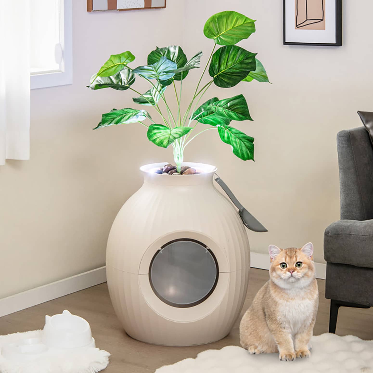 This cool new Smart Plant Hidden Litter Box transforms your cat's traditional litter box area from a smelly, hideous-looking eyesore into a highly discreet decorative planter that hides it right in plain sight. This spacious litter box with advanced odor control is the first one you don't have to hide because it's camouflaged as a decorative planter that looks like a clay pot with an illuminated artificial plant on top. Since you might want to place this litter box out into the open, it features an electronic odor control system that uses ion deodorization to effectively neutralize and eliminate smells, has built-in LED uplighting to illuminate the faux plant on top using 4 different colorful lighting modes, and has a swinging entrance door that can be hidden just by turning the planter around. If you and your furry feline friend are already content with your current litter box situation, this planter could also be used a secret cat bed or a command center to plan sneak attack pounces from. πΌ