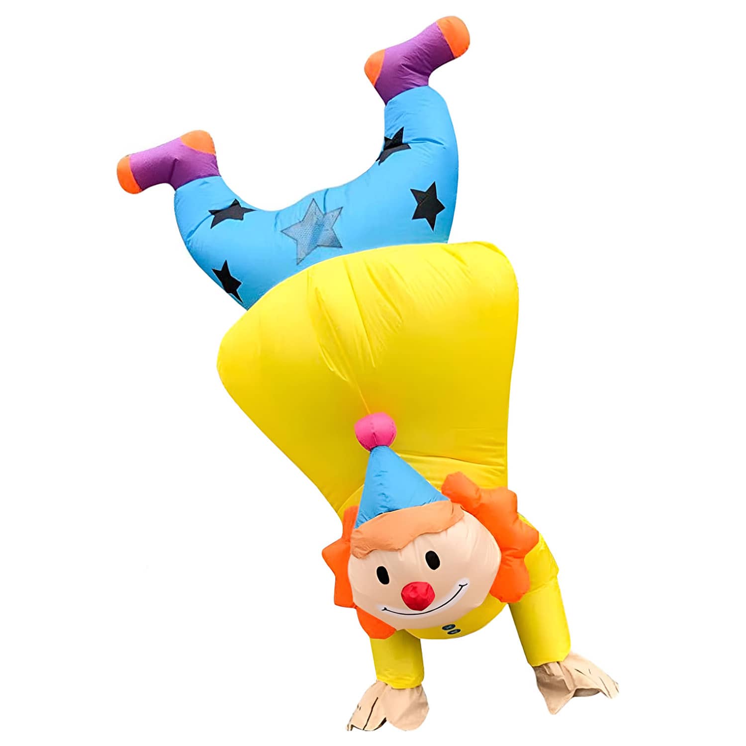 Inflatable costumes are not only the perfect lazy last minute Halloween costumes, they also seem to get the most attention and compliments, which is what you'll get with this cool new Inflatable Handstand Clown Costume. Just step into the upside-down handstand clown suit, zip it up, turn on the built-in inflation fan, and then walk, jump, dance, run, skip, or spin around seemingly on your hands as everyone around you does a super confused double-take. Since your actual feet on the inside look like the hands of the clown on the outside, you can now hop down the stairs on your hands, spin around on one hand, do jumping jacks on your hands, run a marathon on your hands, ride a skateboard on your hands, snowboard down a mountain on your hands, ride a surfboard on your hands, or just chase after people with a fear of clowns on your hands. The possibilities for amazing and impossible clown handstand tricks are nearly endless. Check out the video below to see this inflatable clown in action.π€‘