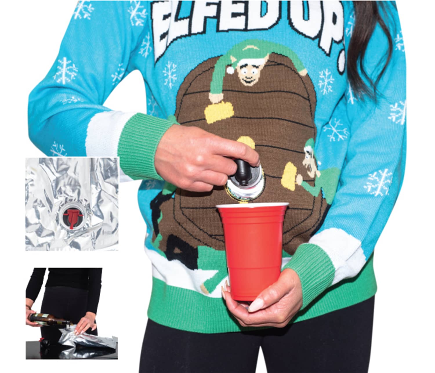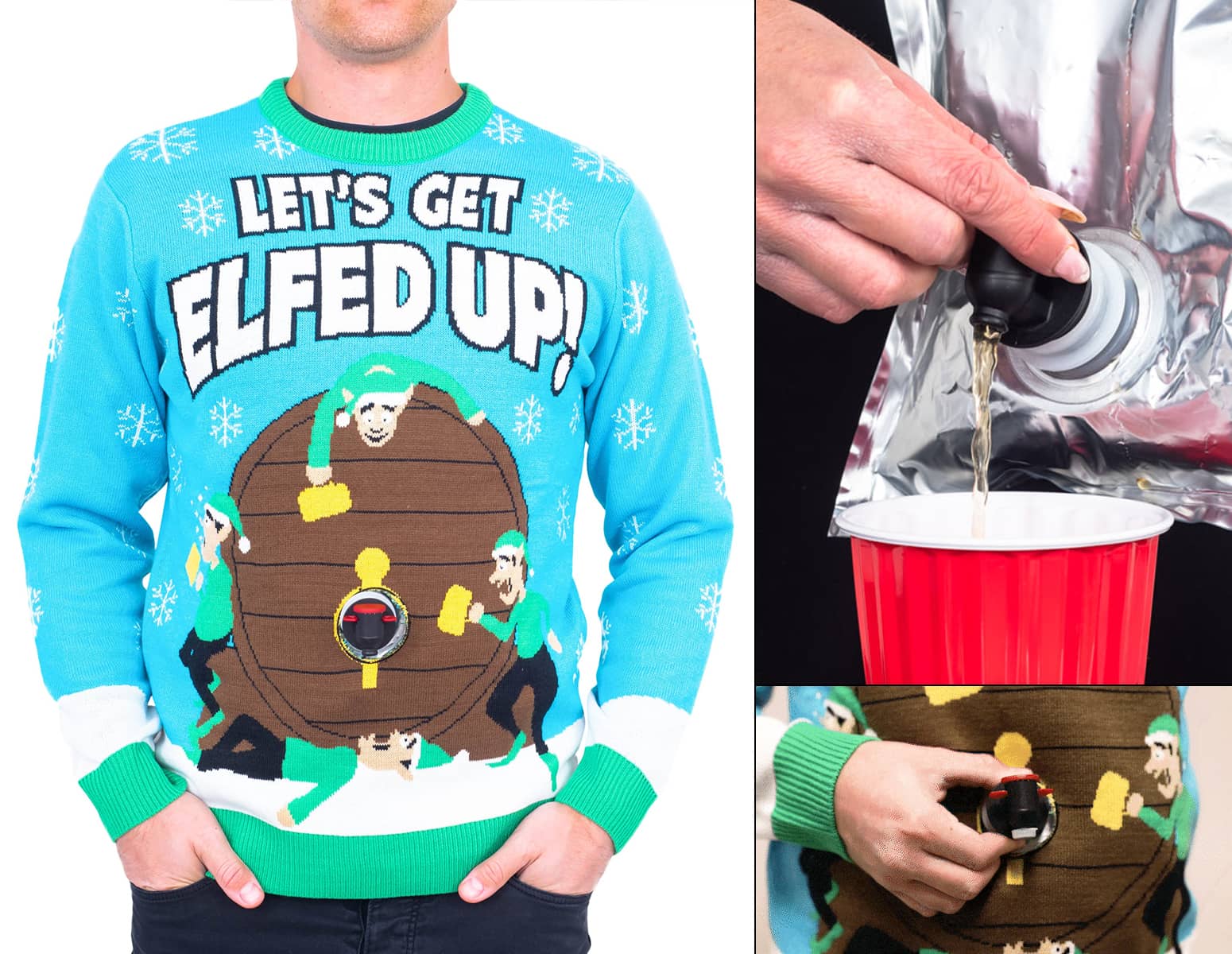 Have a cup of cheer this holiday season when you slip on this cool new Let's Get Elfed Up! Ugly Christmas Sweater and dispense drinks from its built-in beverage dispenser. This extra festive ugly Christmas sweater discreetly holds a 1-liter beverage dispensing bag that can be filled with wine, cocktails, beer, or just straight-up booze. Just fill up the bag, insert it into the sweater, and then pull the dispensing spigot out through the hole. It's perfect for mingling around and dispensing drinks at Christmas parties, watching endless Christmas movies without having to get up to refill your wine, wining ugly Christmas sweater parties, or just anytime you're feeling chilly and need a little extra Christmas "spirit" to warm you up and help get you through the crazy holidays. Check out the video below to see it in action. ππ·