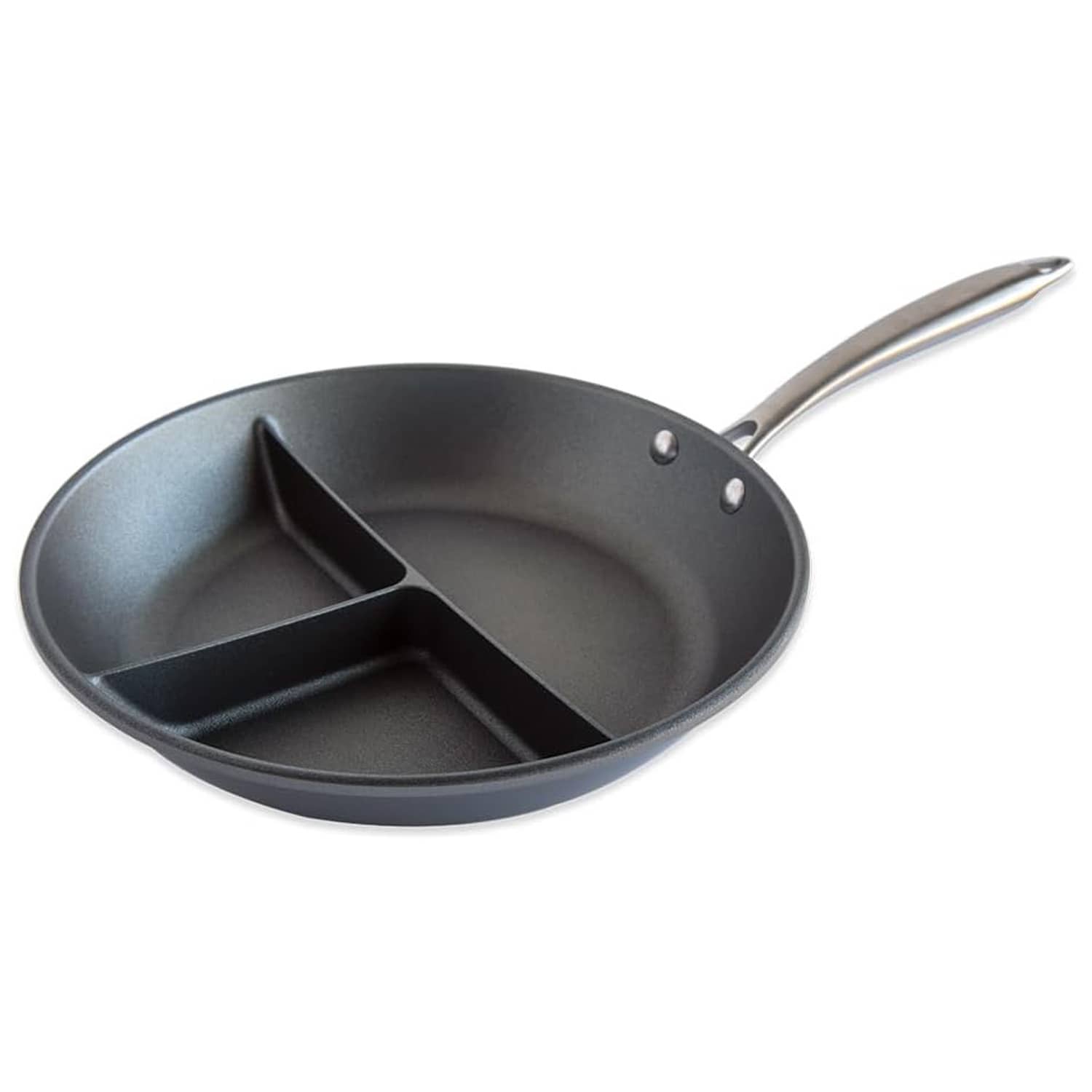 Want to cook multiple foods at the same time, in the same pan? Then check out these cool new Nordic Ware Divided Pans. Available in either a 3-in-1 SautΓ© Pan or a 2-in-1 Sauce Pan, these versatile nonstick, cast aluminum pans have divided sections that let you cook multiple foods simultaneously, so you can save valuable time in the kitchen and have much less to clean up later. They're great for making a main dish and sides, saving space in smaller kitchens, reheating leftovers, making meals for picky eaters, portion control, and more. π¨πΌβπ³
